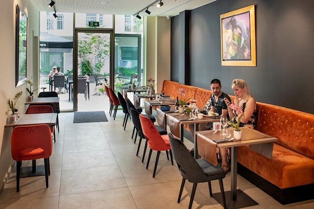 - 65 zitplaatsen binnen en een terras vooraan voor 20 personen + een gezellig terras in de binnentuin voor 30 personen