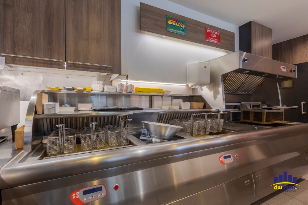 De frituur is volledig uitgerust met professioneel materiaal, waaronder een Perfecta friteuse met automatische voorbak en pompsysteem voor het vet, een Merrychef high-speed oven, een gasvuur met vier bekken, microgolfovens, een gekoelde toonbank, een frigocel en diepvriescel, verschillende drankenkoelingen en een industriële vaatwasmachine. Daarnaast zijn er vier tv-schermen aanwezig in de zaak camerabewaking & airco.