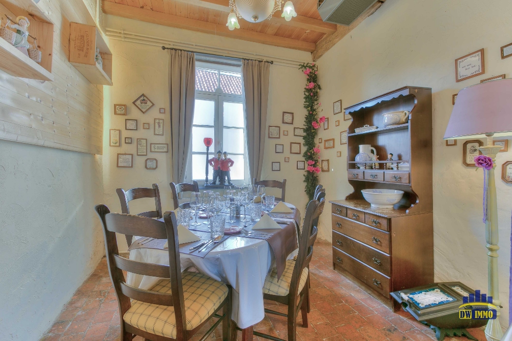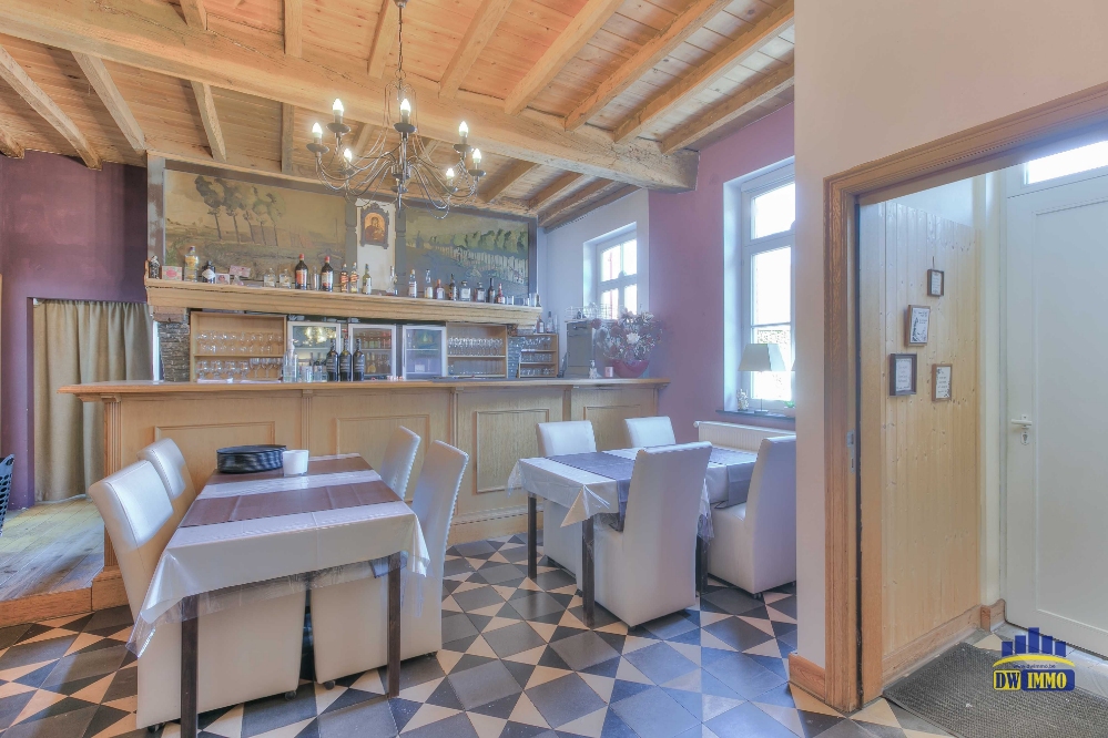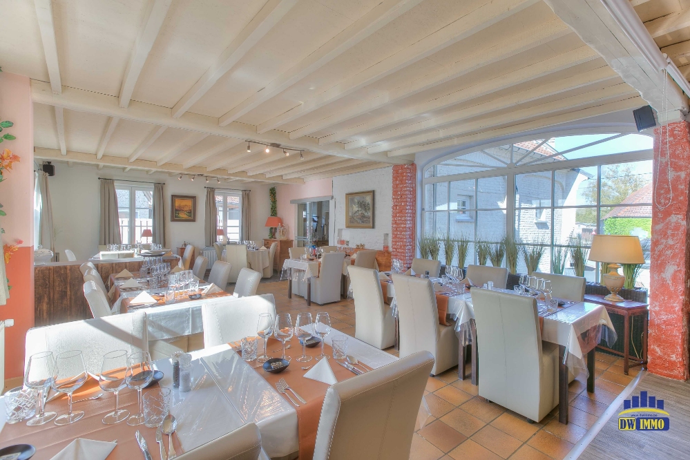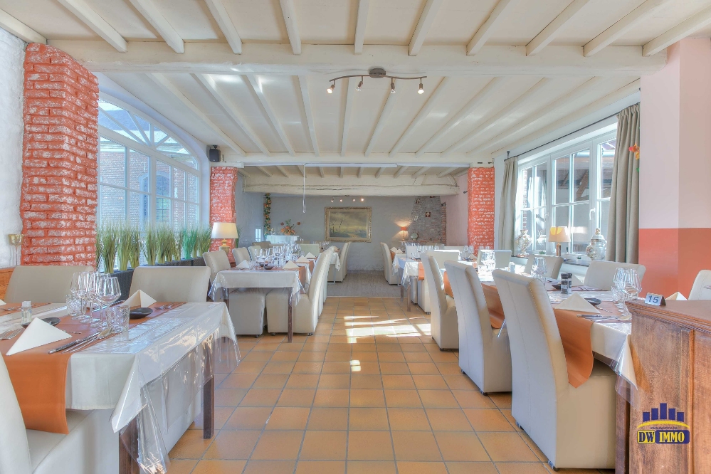 Volledig ingerichte keuken o.a. frigo en koelcel, vaatwasmachine, gasvuur 4 bekken, Open haard om te grillen in de zaal; instapklaar, zaaltje apart voor feesten en koffietafels + woonst.