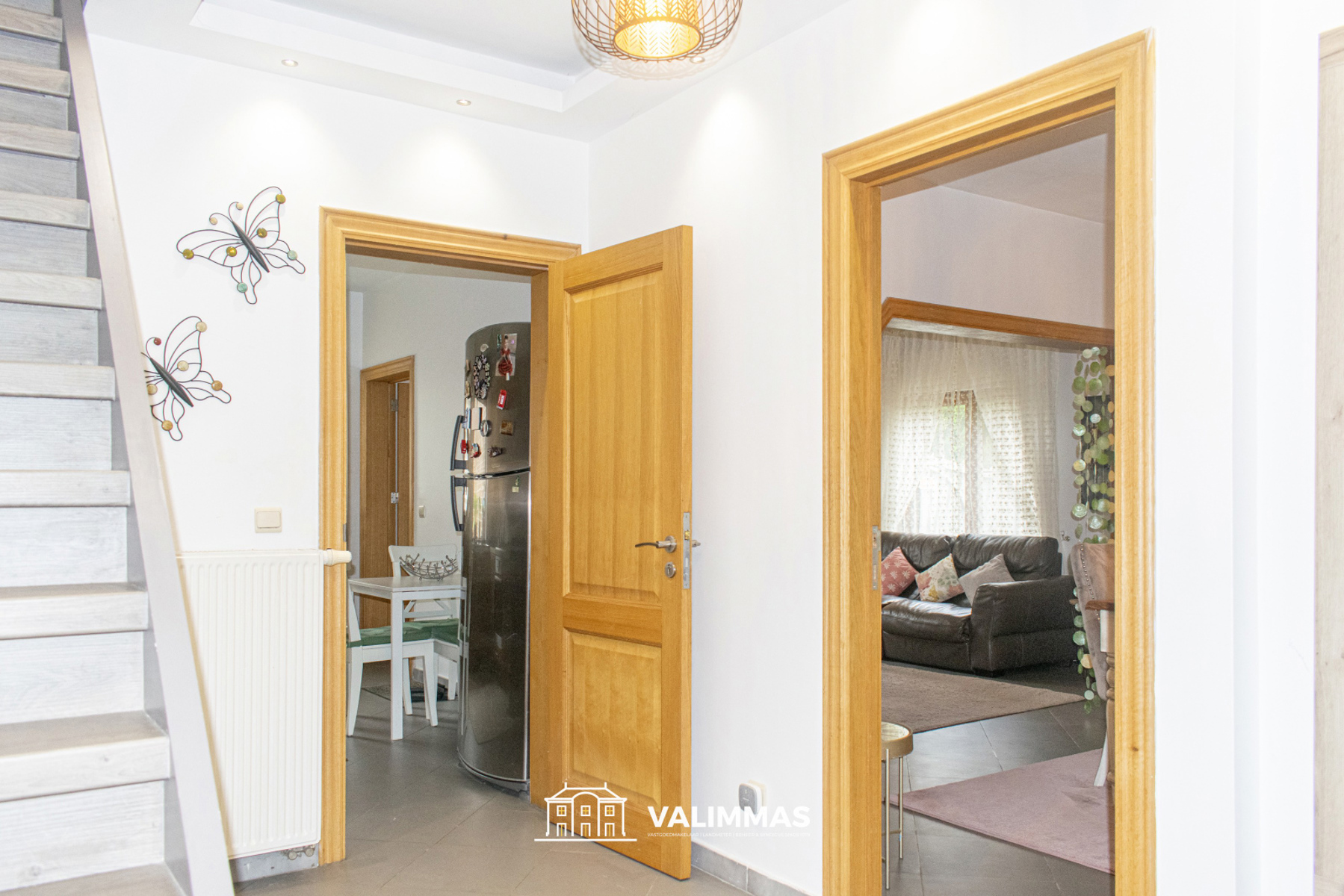 Het gelijkvloers omvat een inkomhal, een living met eetkamer en salon, en een ingerichte keuken.