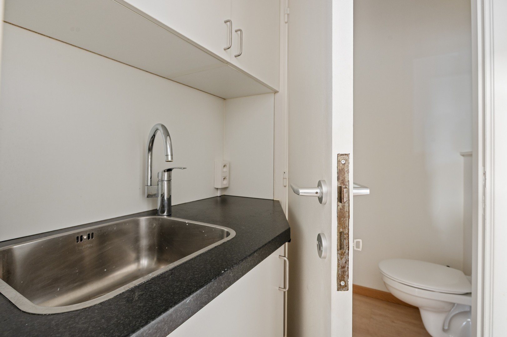 Sanitaire ruimte: De sanitaire ruimte is praktisch ingericht met een lavabo en keukenkast. Achter de deur bevindt zich een apart toilet, wat zorgt voor extra privacy.