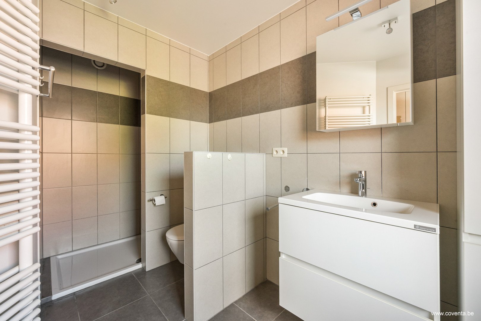 Op de verdieping, nachthal met ingemaakte kasten, technische ruimte, badkamer met inloopdouche en toilet en 1ste slaapkamer.