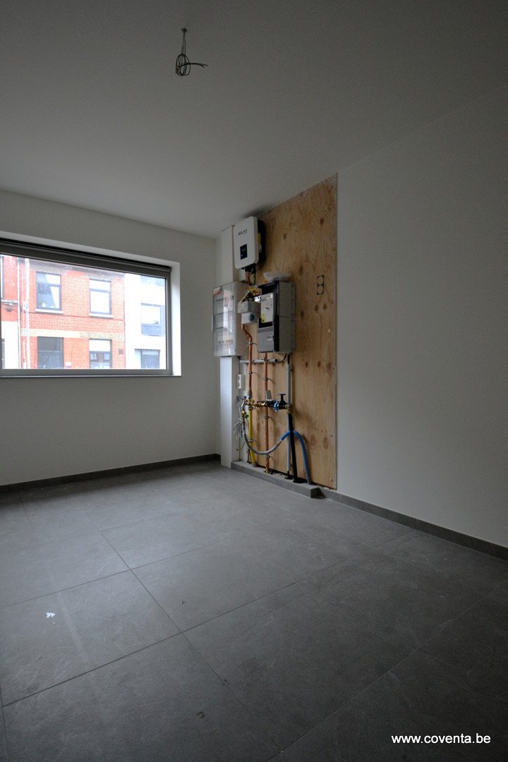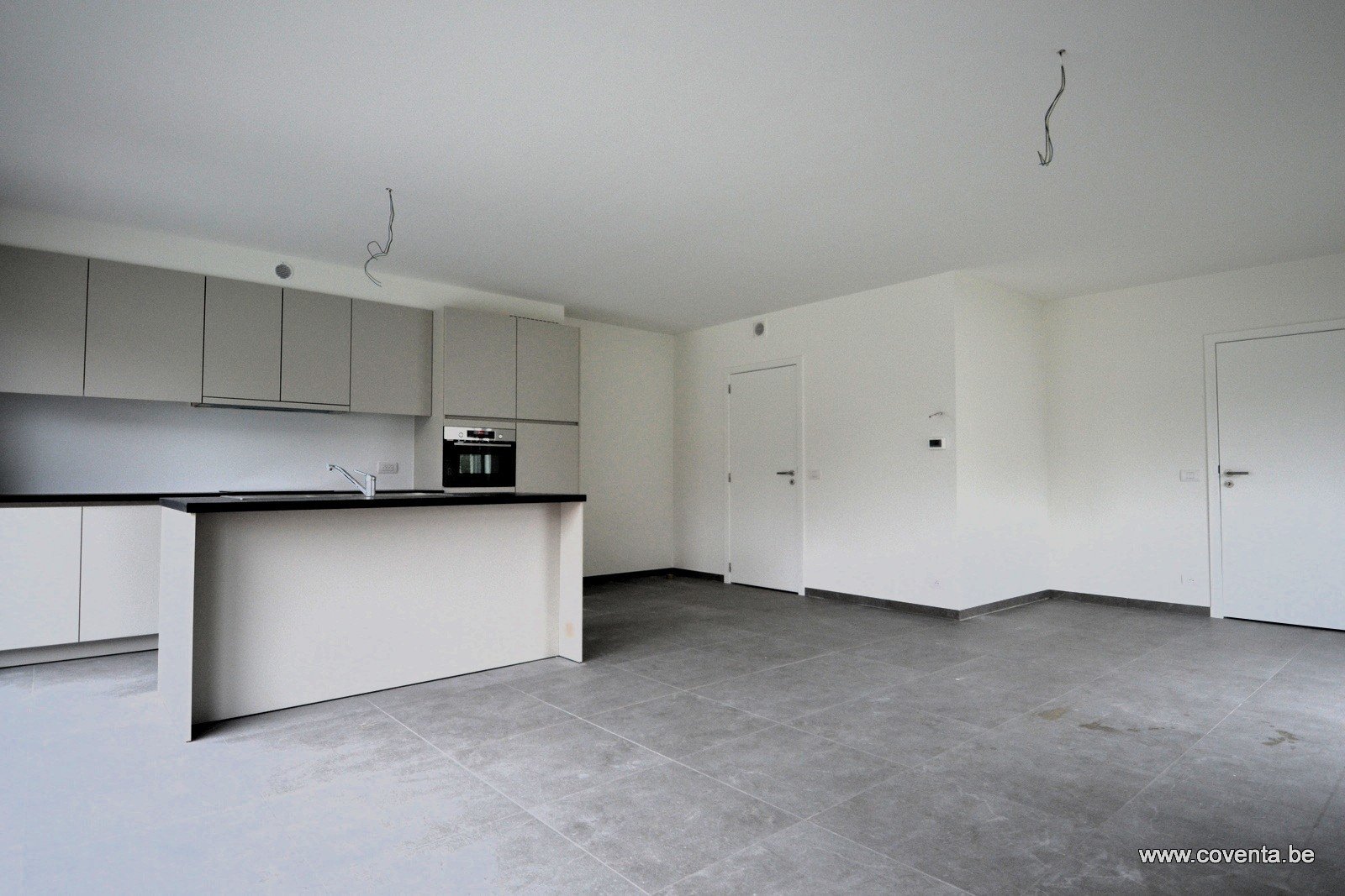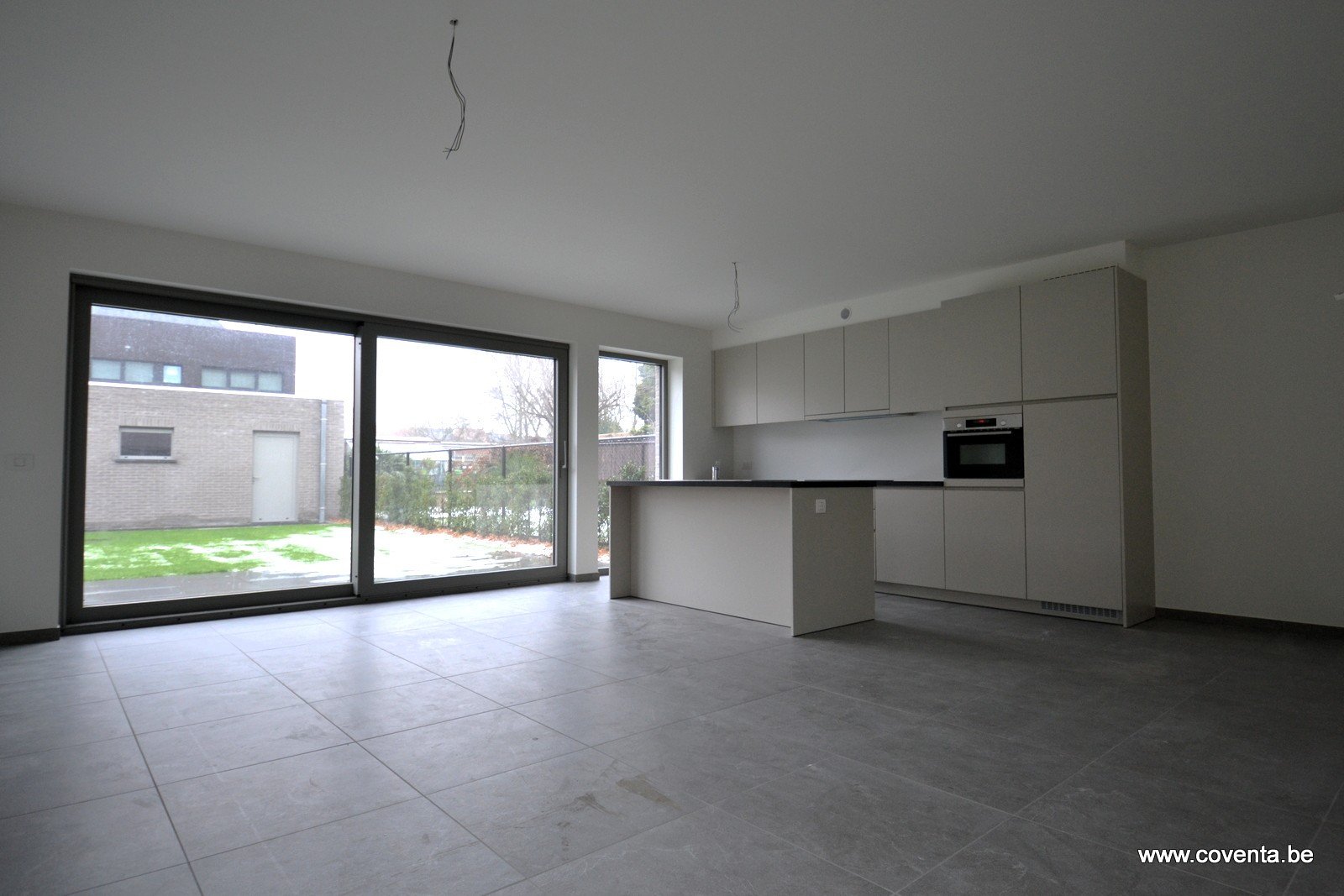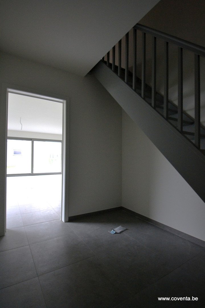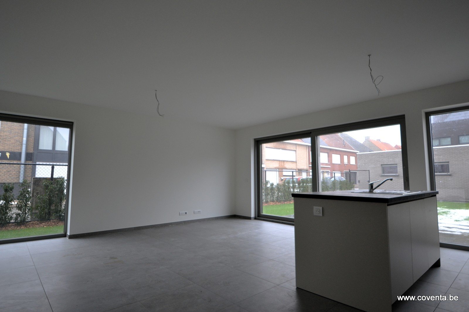 Nieuwbouwwoning te huur te Izegem. Deze woning heeft als indeling: inkomhal met toilet, woonkamer-salon met aansluitende moderne keuken en grote berging/wasplaats.