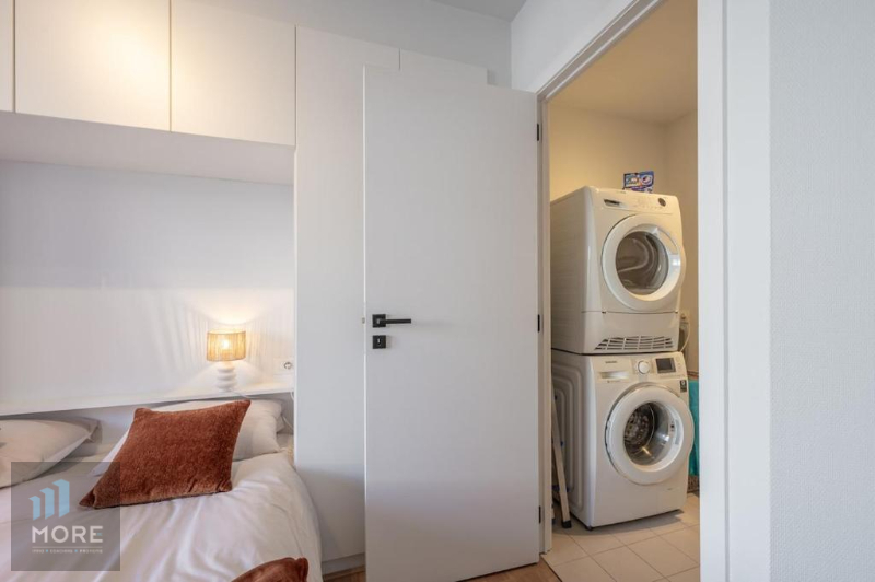 Indeling: woonkamer met zit- & eetgedeelte uitgevend op een balkon aan de straatzijde, halfopen keuken, gastentoilet, berging, badkamer met bad/douchecombinatie, wasplaats, twee slaapkamers met dubbelbed uitgevend op een terras – met buiten berging – aan de achterzijde, gemeenschappelijke fietsenberging op de -1. Contacteer ons vrijblijvend voor een bezoek en oordeel zelf!