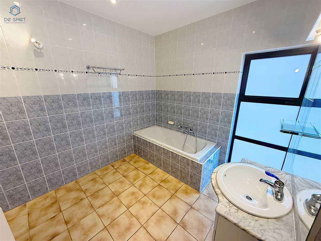 Ingerichte badkamer voorzien van ligbad, inloopdouche en lavabomeubel.