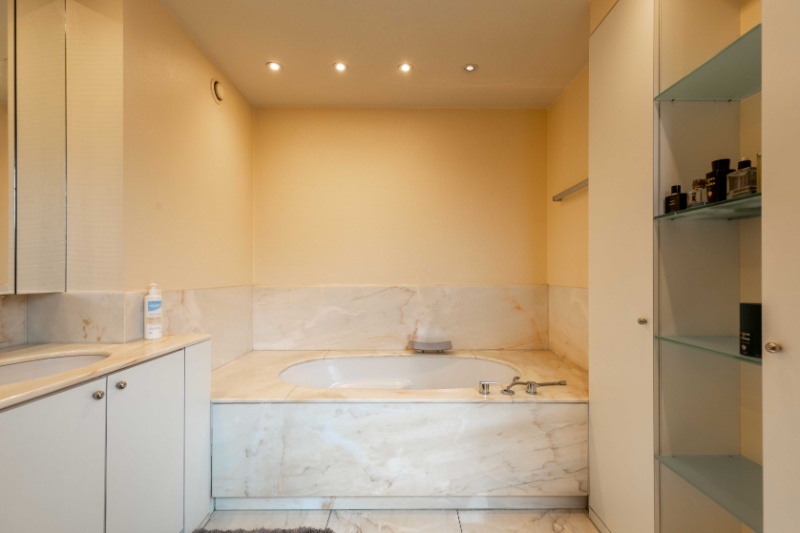 Tweede niveau: Een elegante trap brengt u naar de royale overloop op het bovenste niveau. Hier bevinden zich twee ruime slaapkamers, waaronder een luxe masterbedroom met op maat gemaakte dressing en een en-suite badkamer met ligbad en een dubbele wastafel in marmer. Daarnaast is er een tweede slaapkamer met ingebouwde kasten, een berging met douche en een apart toilet.