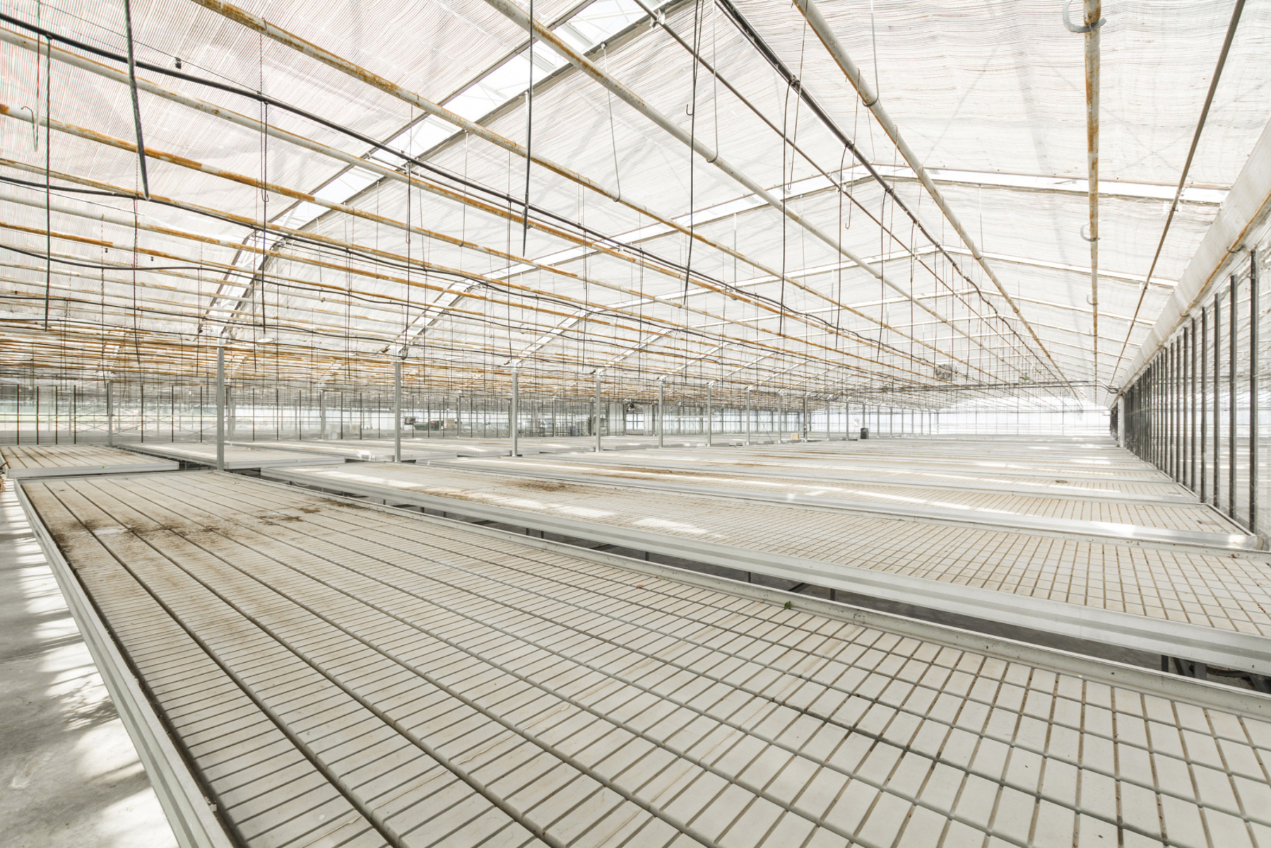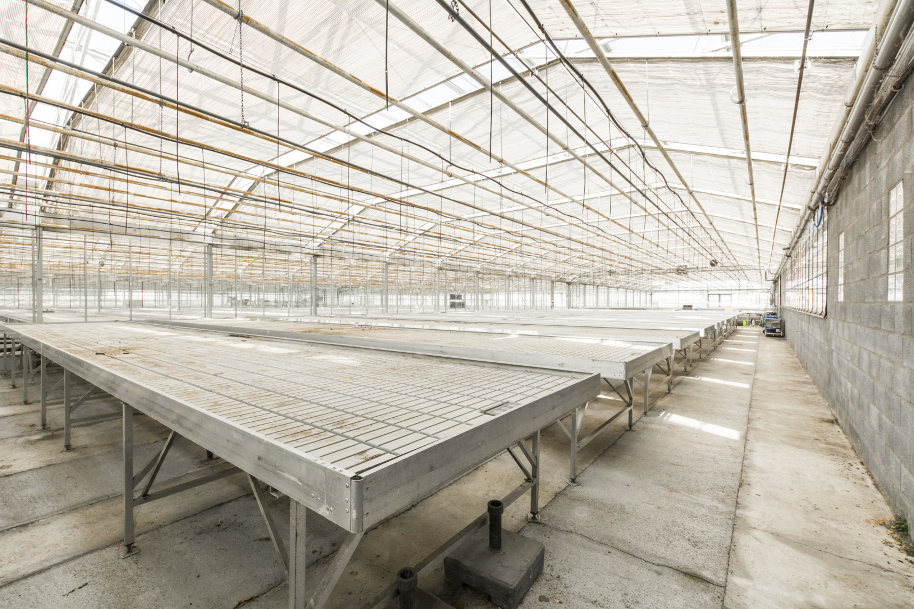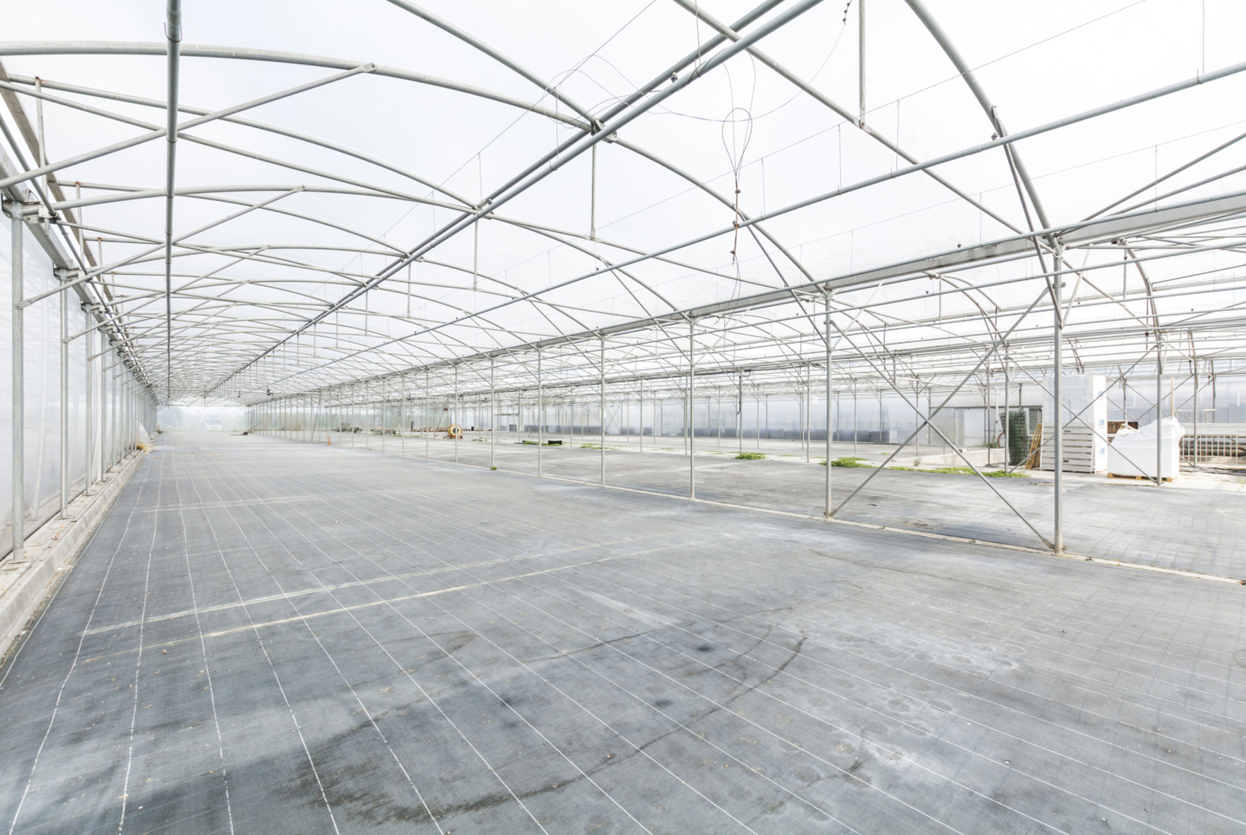 Serres grotendeels metalen constructies met glas, deels met thermofloor. Circa 10.000m² (eventueel moduleerbaar, vanaf minimaal 3.000m²).