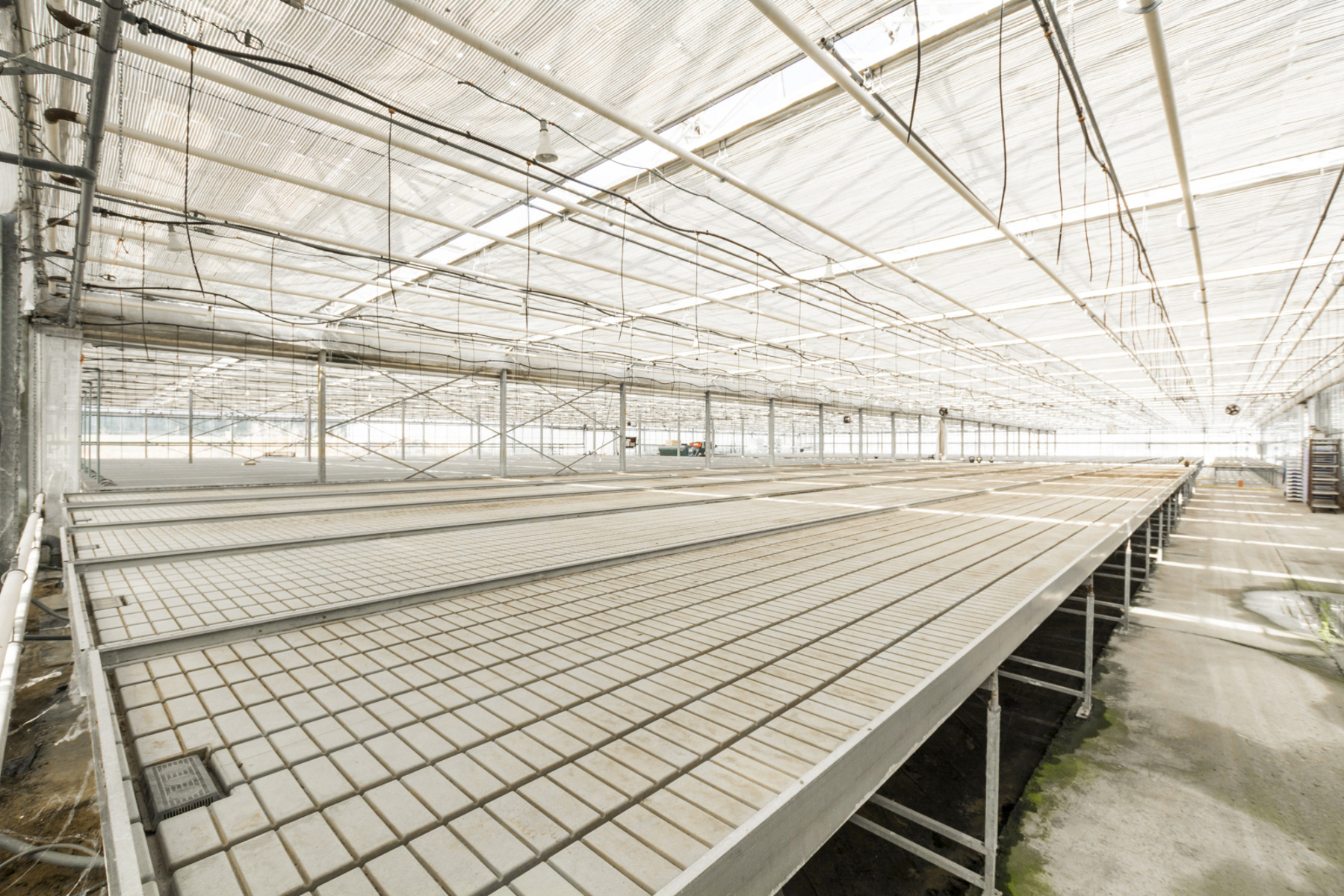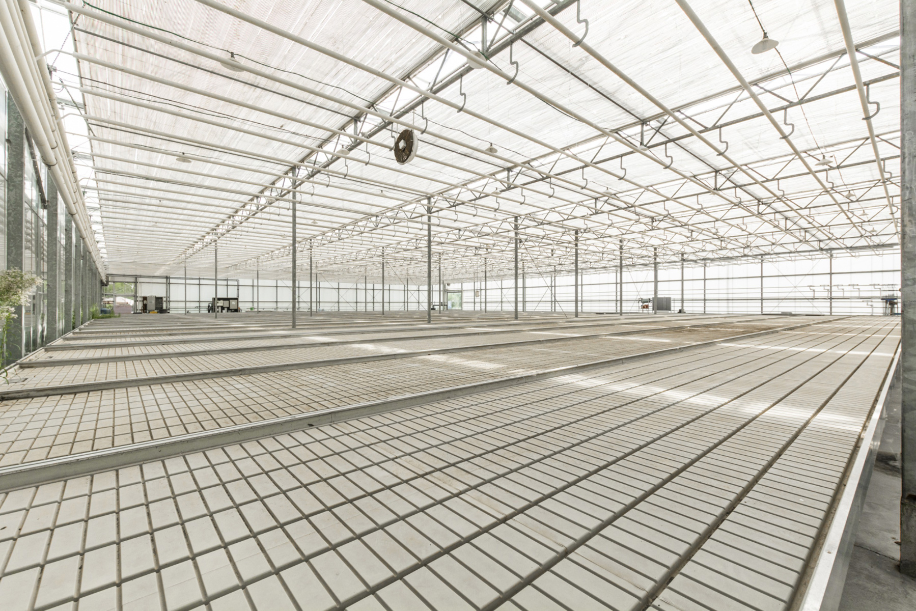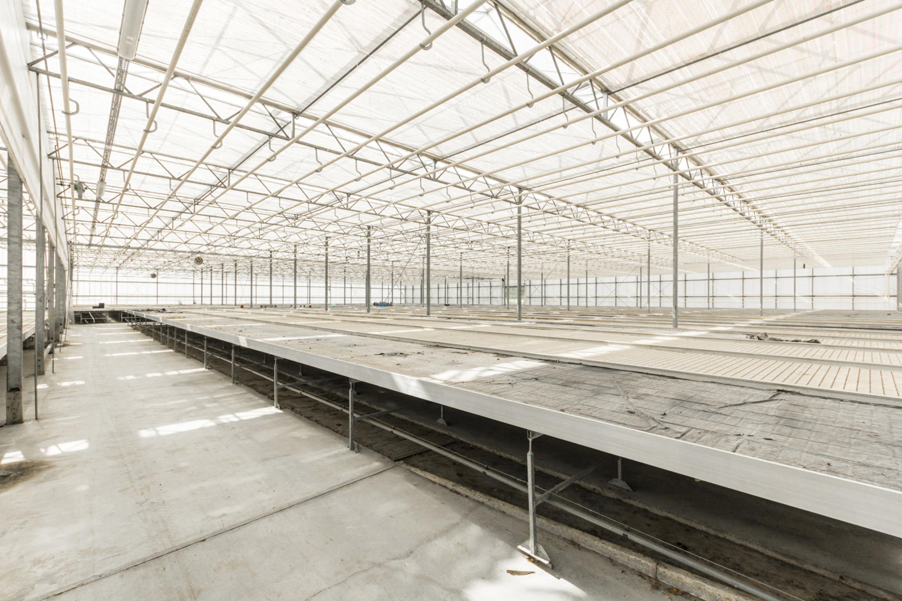 Serres grotendeels metalen constructies met glas, deels met thermofloor. Circa 10.000m² (eventueel moduleerbaar, vanaf minimaal 3.000m²).