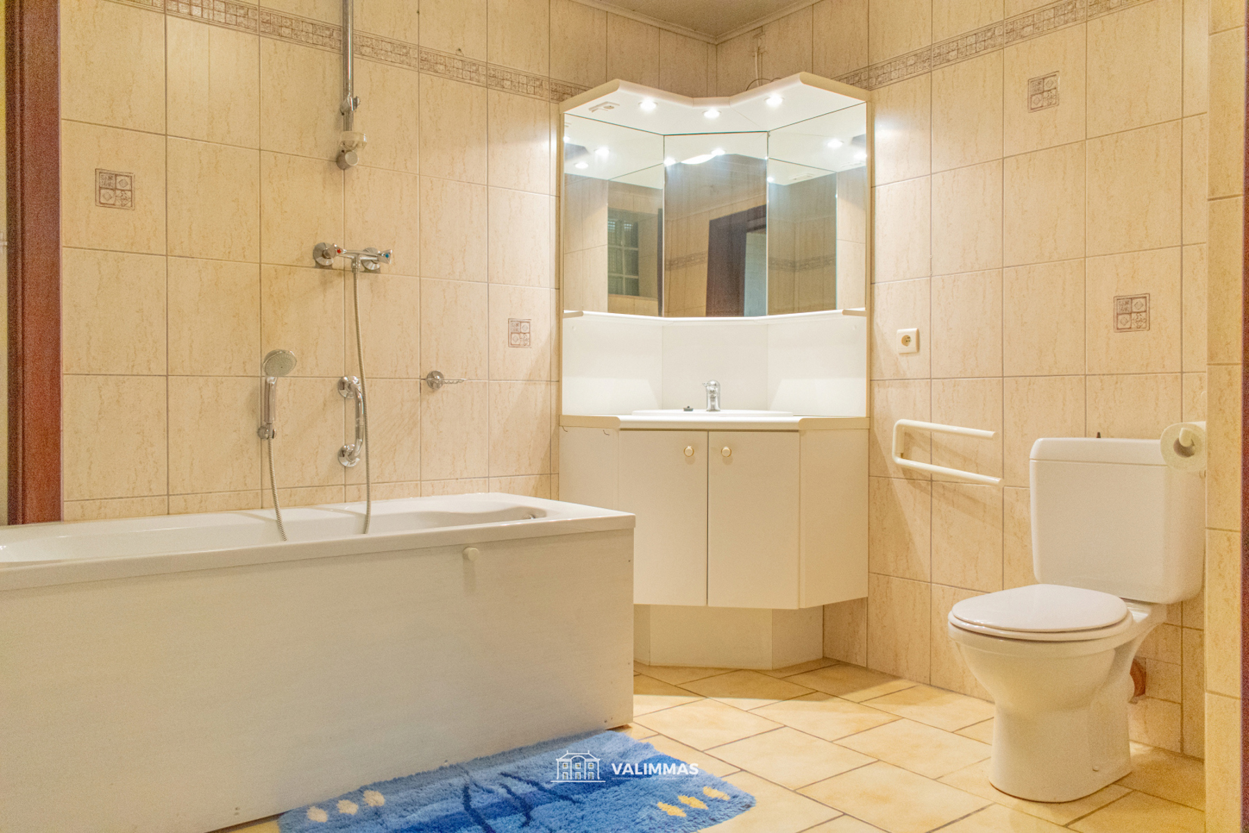 Het gelijkvloers omvat oa. een inkomhal, een toilet, een mooie living in L-vorm, een ingebouwde keuken, een berging, een badkamer met ligbad en douche, een bureel, een tweede ingerichte keuken, een slaapkamer en een tweede badkamer met ligbad.