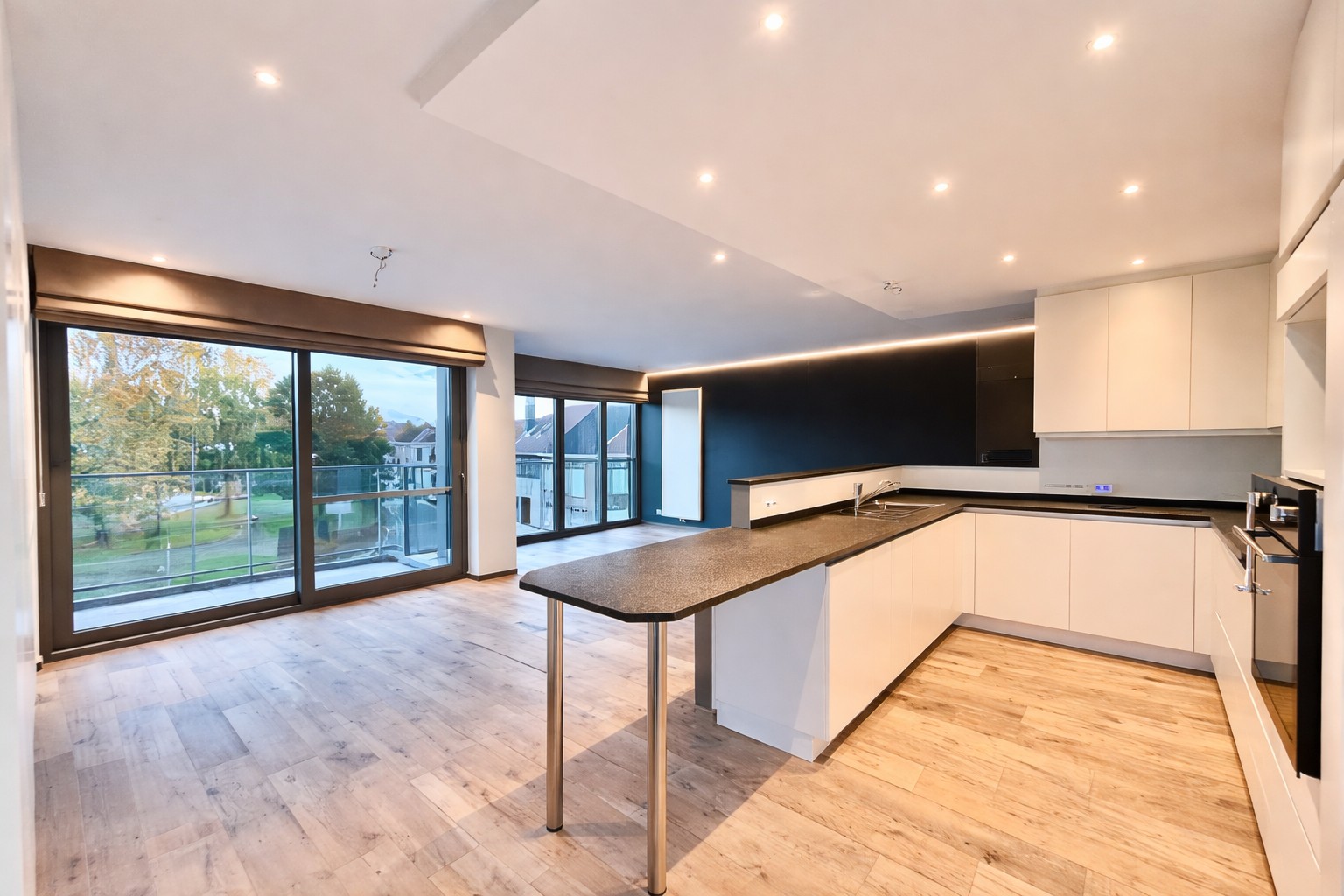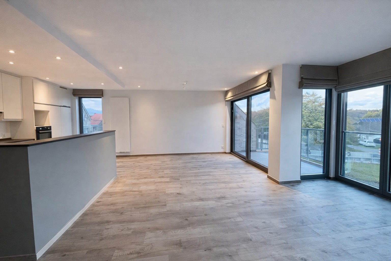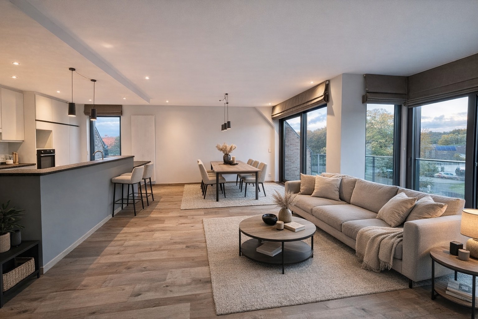 De ruime leefruimte met open keuken vormt het hart van de woning en geniet van veel natuurlijk licht via de grote raampartijen. Aansluitend bevinden zich twee terrassen, zowel aan de voor- als achterzijde, waardoor u op elk moment van de dag van zon of schaduw kan genieten.