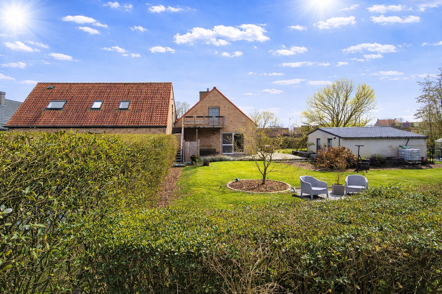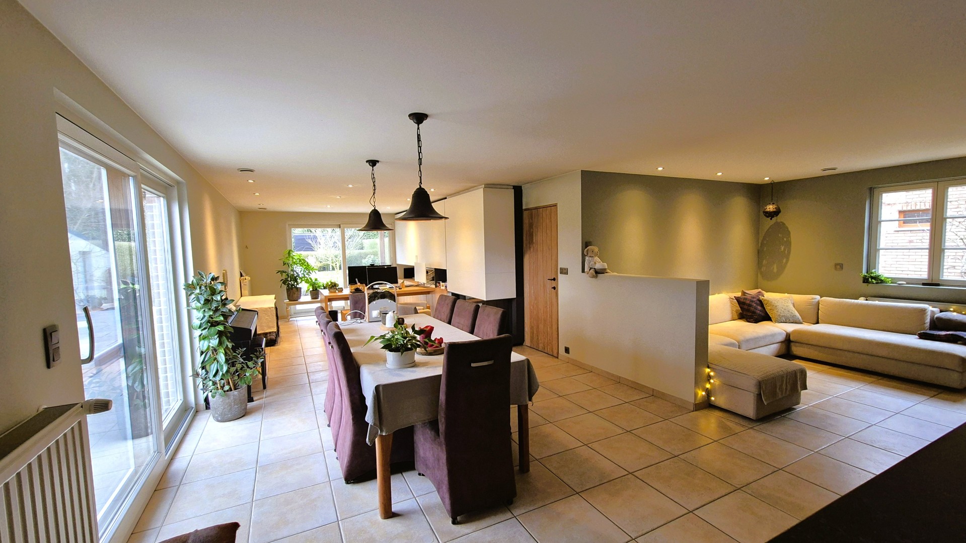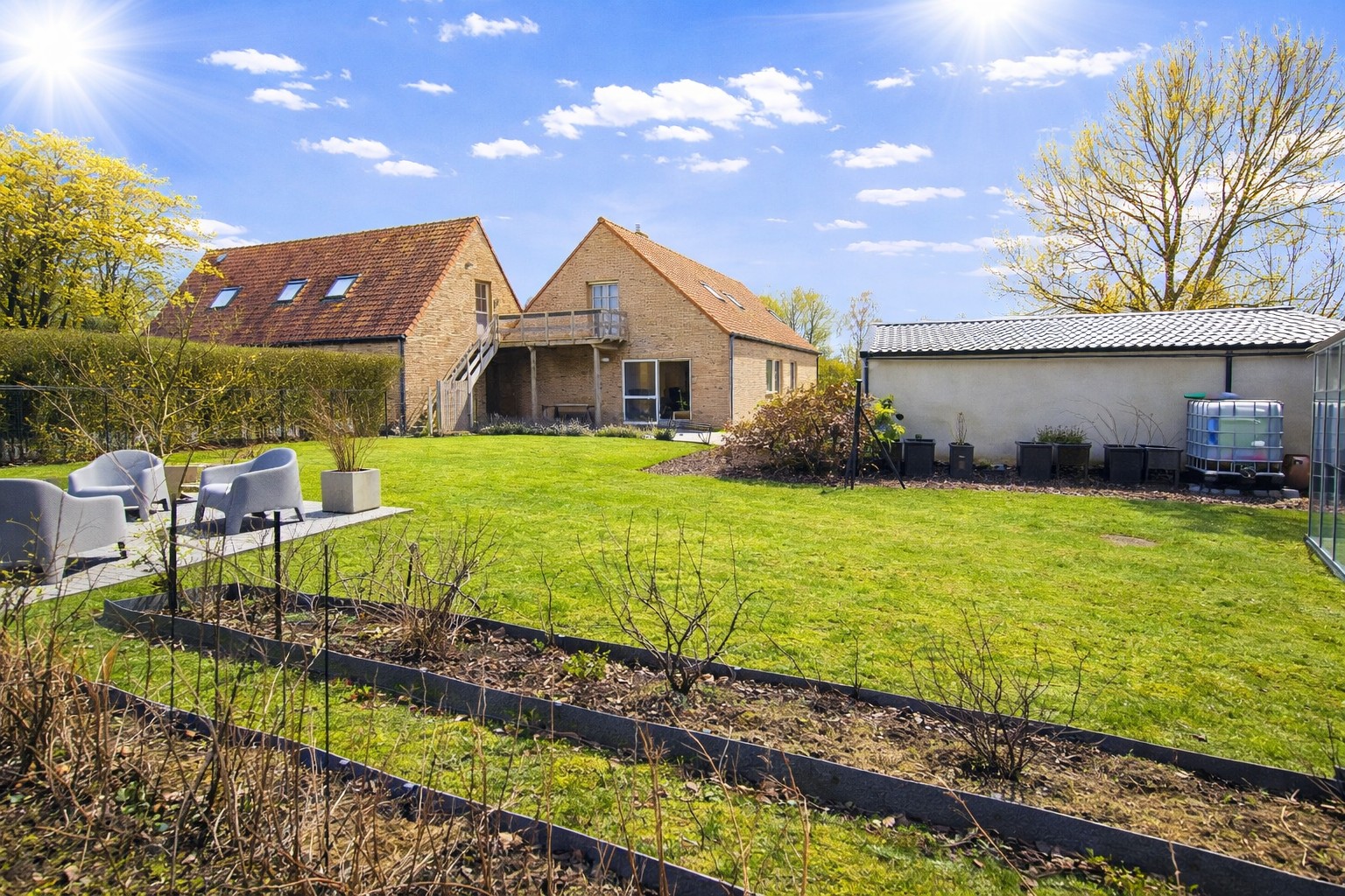 De hoofdwoning (nieuwbouw in 2003) heeft een bruikbare vloeroppervlakte van maar liefst 246 m² en omvat een inkomhal met op maat gemaakte inbouwkasten, een ruime leefruimte met salon en gashaard, een geïntegreerd bureau met inbouwkasten, een grote kwaliteitsvolle keuken met kookeiland (5 pits inductiekookplaat), steamer Miele, vaatwasser Miele,… afwerking met natuurstenen werkblad en heel veel kastruimte, koele berging, apart toilet (hangWC), badkamer (gelijkvloers) met dubbele lavabo, ligbad en douche, een aparte wasplaats met ook technieken (CV ketel Viessman en zonneboiler) en een inpandige garage met elektrische sectionaal poort.