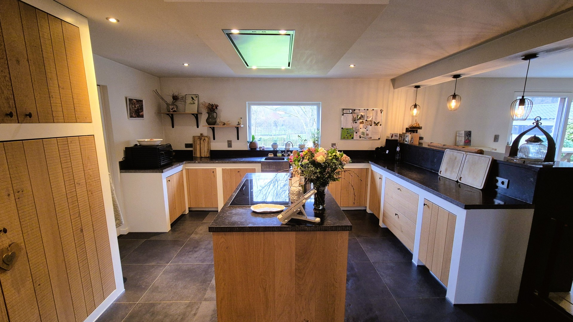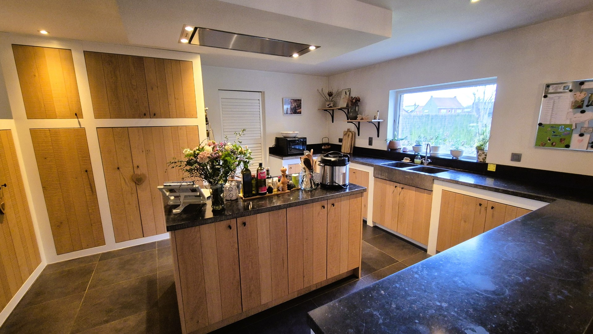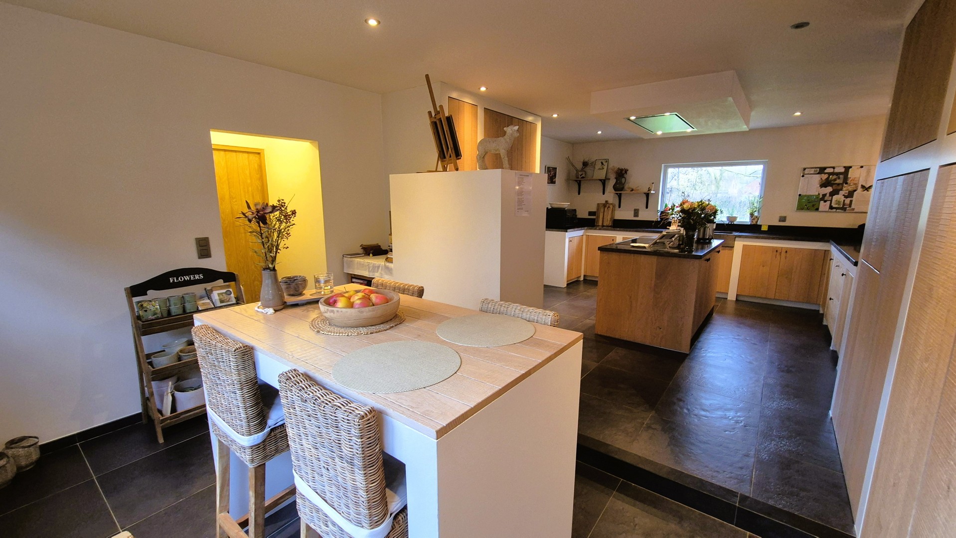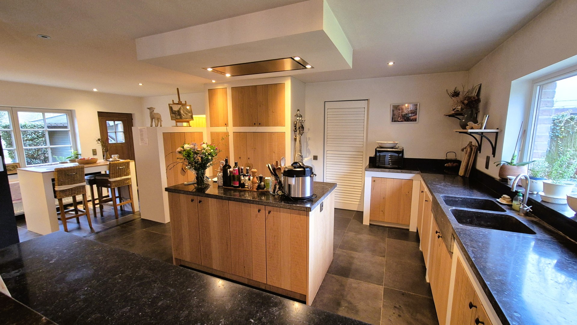 De hoofdwoning (nieuwbouw in 2003) heeft een bruikbare vloeroppervlakte van maar liefst 246 m² en omvat een inkomhal met op maat gemaakte inbouwkasten, een ruime leefruimte met salon en gashaard, een geïntegreerd bureau met inbouwkasten, een grote kwaliteitsvolle keuken met kookeiland (5 pits inductiekookplaat), steamer Miele, vaatwasser Miele,… afwerking met natuurstenen werkblad en heel veel kastruimte, koele berging, apart toilet (hangWC), badkamer (gelijkvloers) met dubbele lavabo, ligbad en douche, een aparte wasplaats met ook technieken (CV ketel Viessman en zonneboiler) en een inpandige garage met elektrische sectionaal poort.
