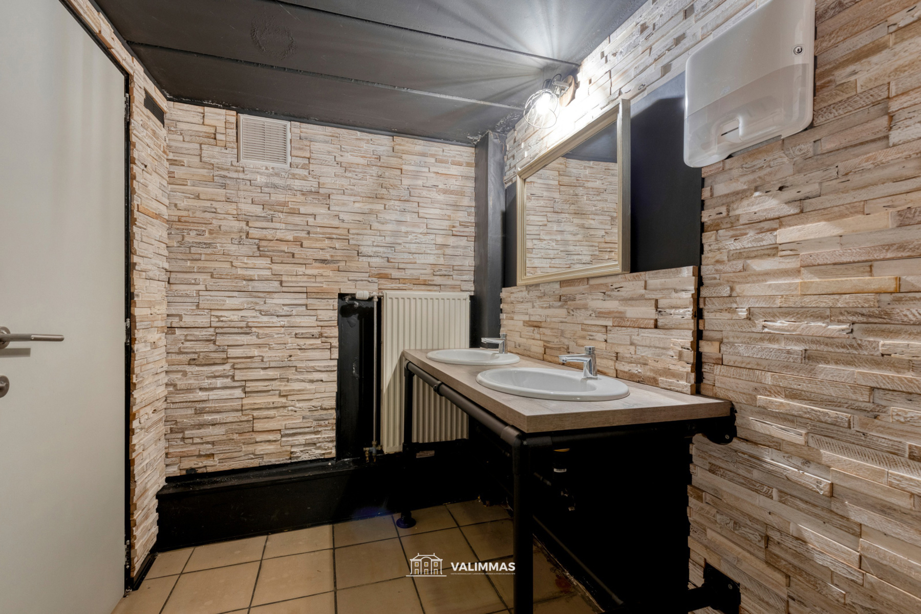 Het gelijkvloers omvat een ruime verbruikszaal (± 90m²) met toog, een sanitaire ruimte met toiletten, en een grote keuken met koelcel.