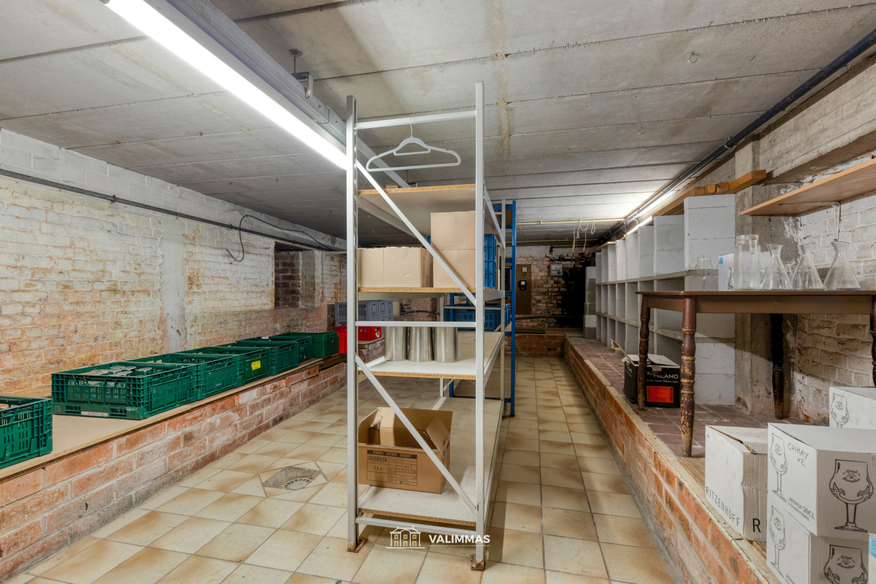 Het gelijkvloers omvat een ruime verbruikszaal (± 90m²) met toog, een sanitaire ruimte met toiletten, en een grote keuken met koelcel.