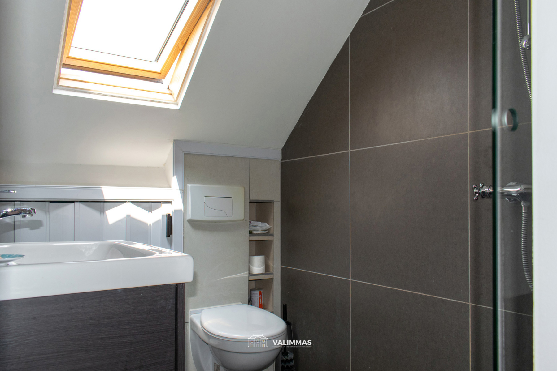 De dakverdieping werd ingericht als een studio met een grote slaapkamer/leefruimte, een mezzanine/bureel, een ingerichte kitchenette, en een badkamer met inloopdouche.