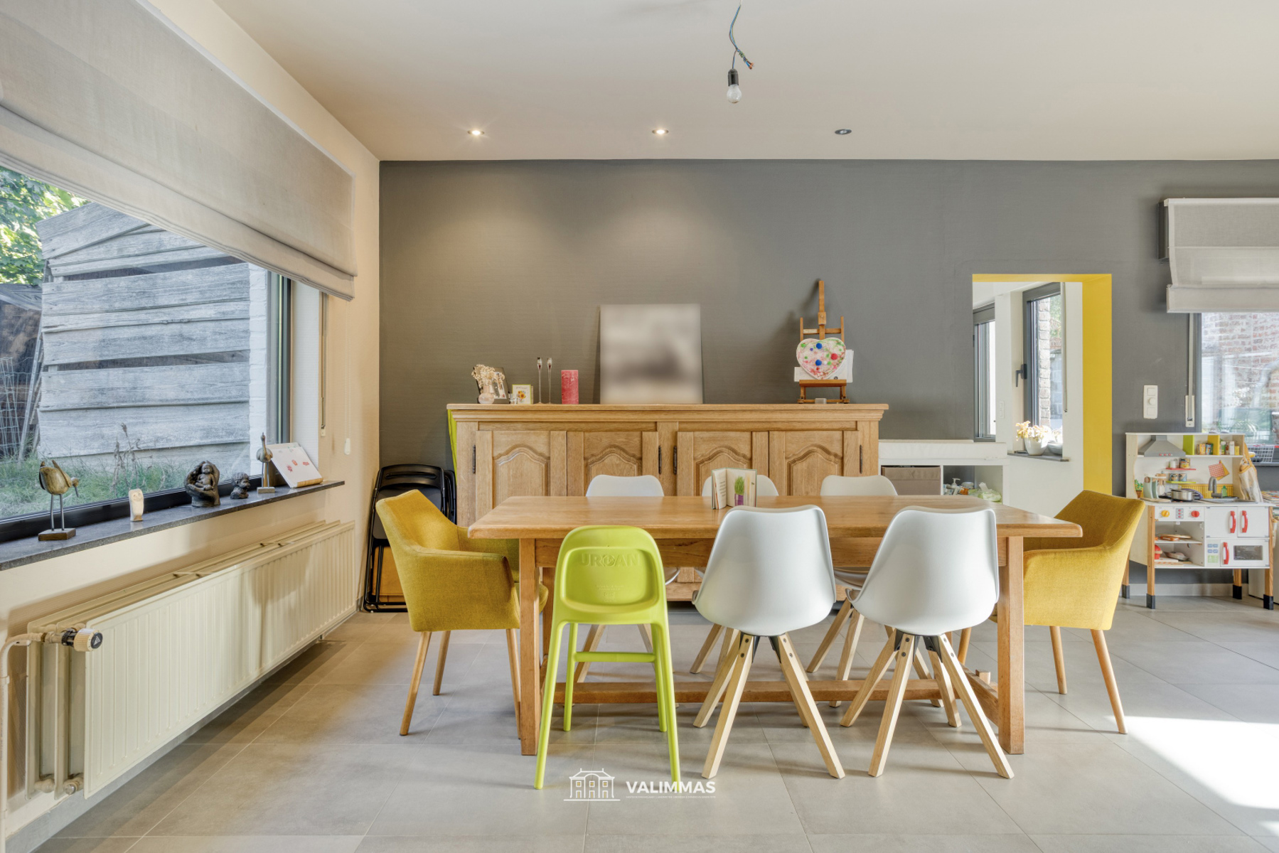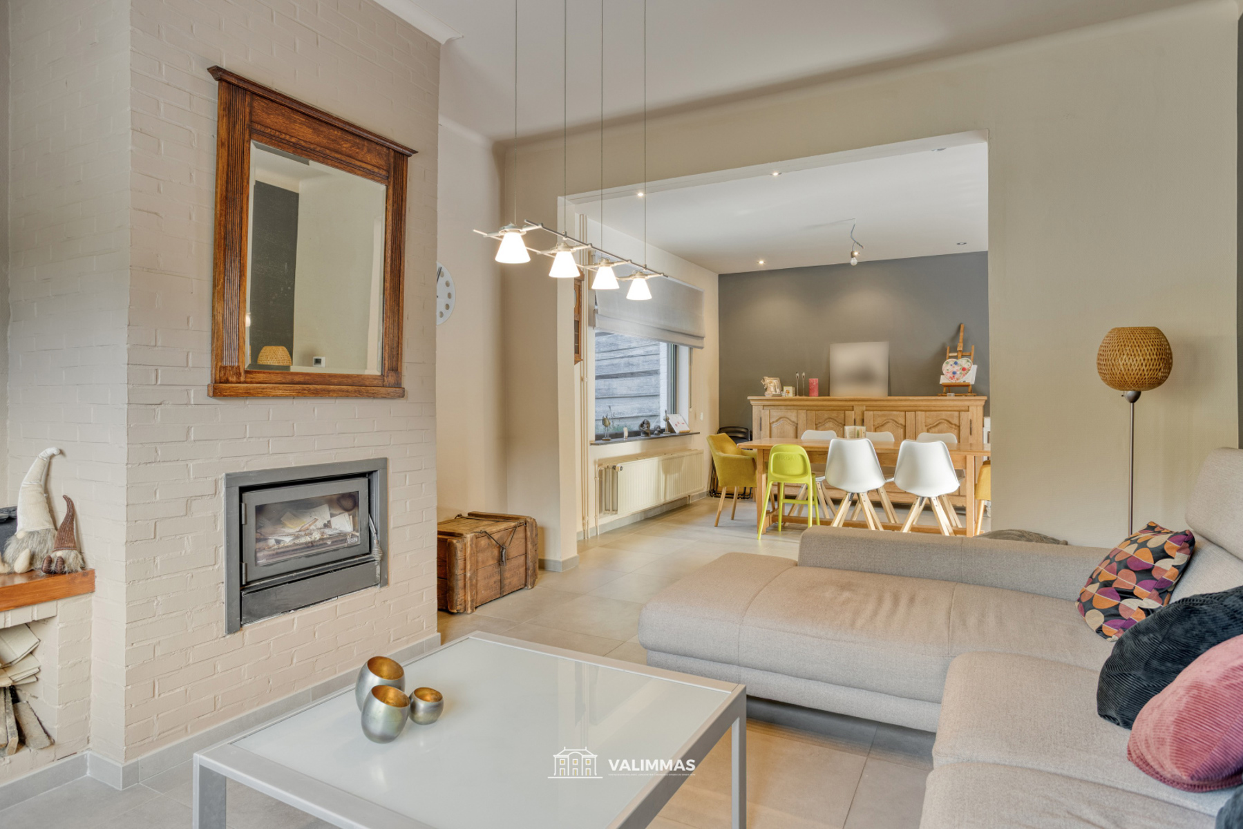Het gelijkvloers bestaat uit een inkomhal, een salon met open haard (inbouwcassette), een ruime eetkamer (met speelhoek), een volledig ingebouwde keuken met eethoek, een berging, een toilet, en een ruime aparte garage met geautomatiseerde sectionaalpoort.