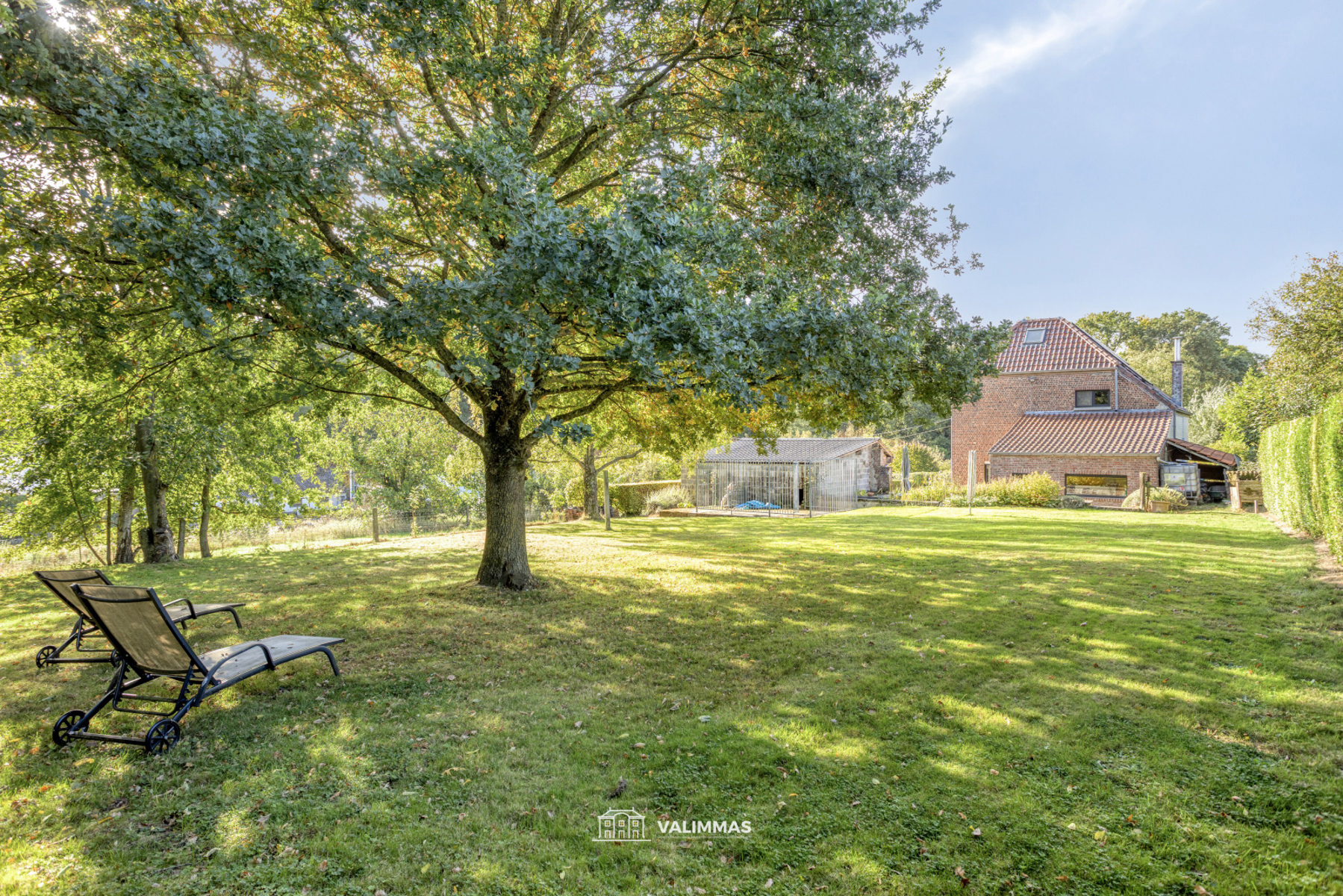 Achteraan, in een oase van rust, vinden we nog het terras en de grote tuin met tuinberging en hondenkennel.