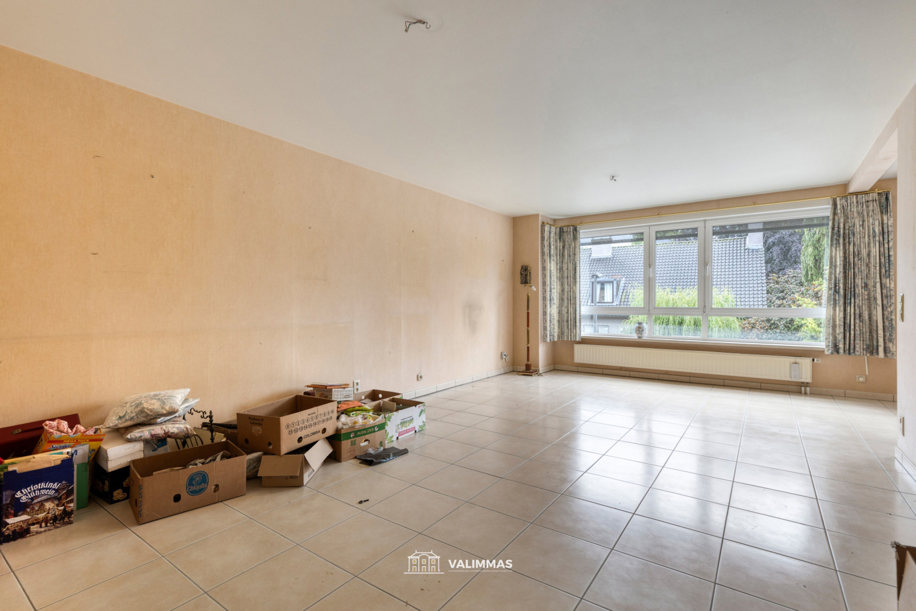 Het gelijkvloers bestaat uit een inkomhal met trap en lift, een ruime garage met was- en stookplaats, een living met open ingerichte keuken en mooi zicht op de tuin, een berging, een bureel of slaapkamer, en een badkamer.