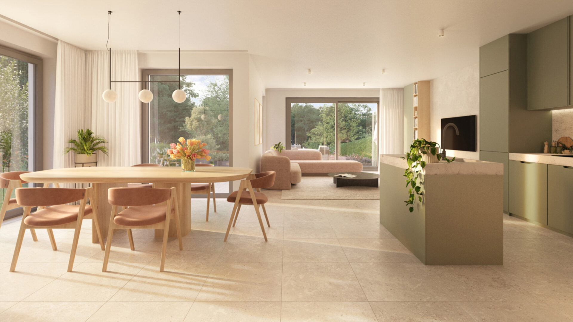 Het gelijkvloers bestaat uit een inkomhal, een toilet, een ruime living met salon en open ingerichte keuken, een berging/waspplaats, en een carport.