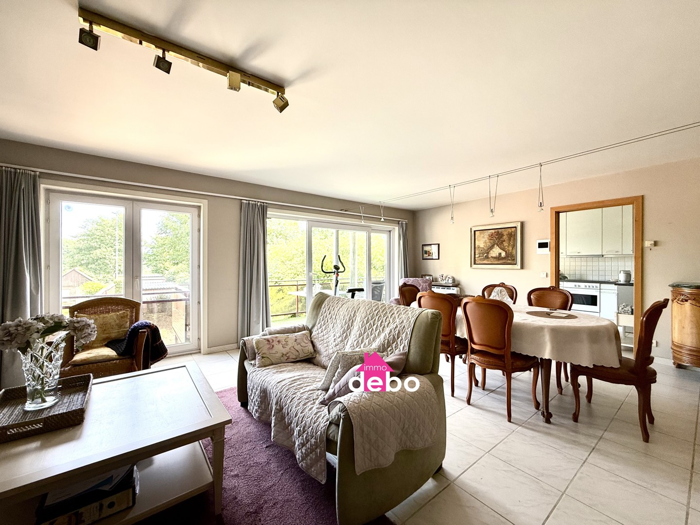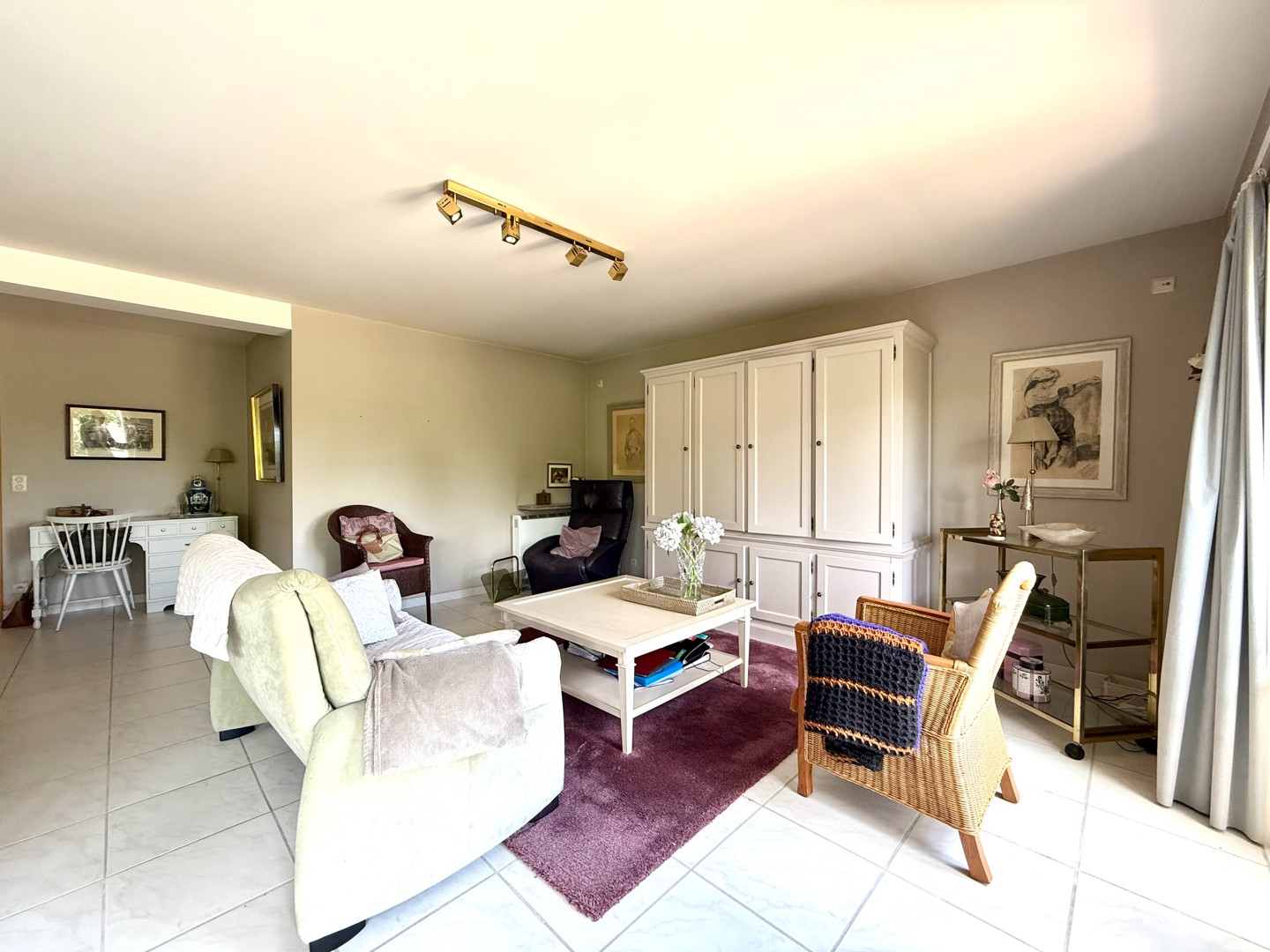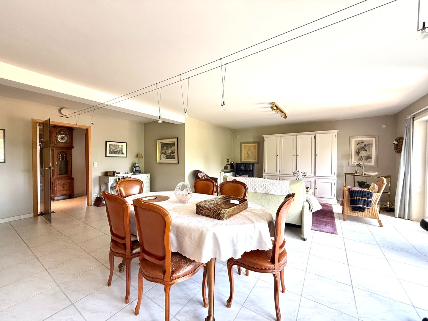 De leefruimte is bijzonder aangenaam dankzij de grote raampartijen die zorgen voor overvloedig natuurlijk licht. De open indeling sluit naadloos aan op de volledig uitgeruste keuken.