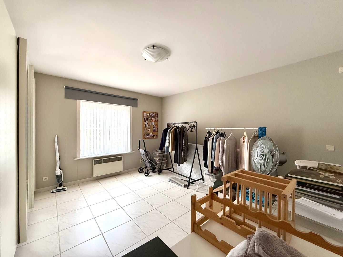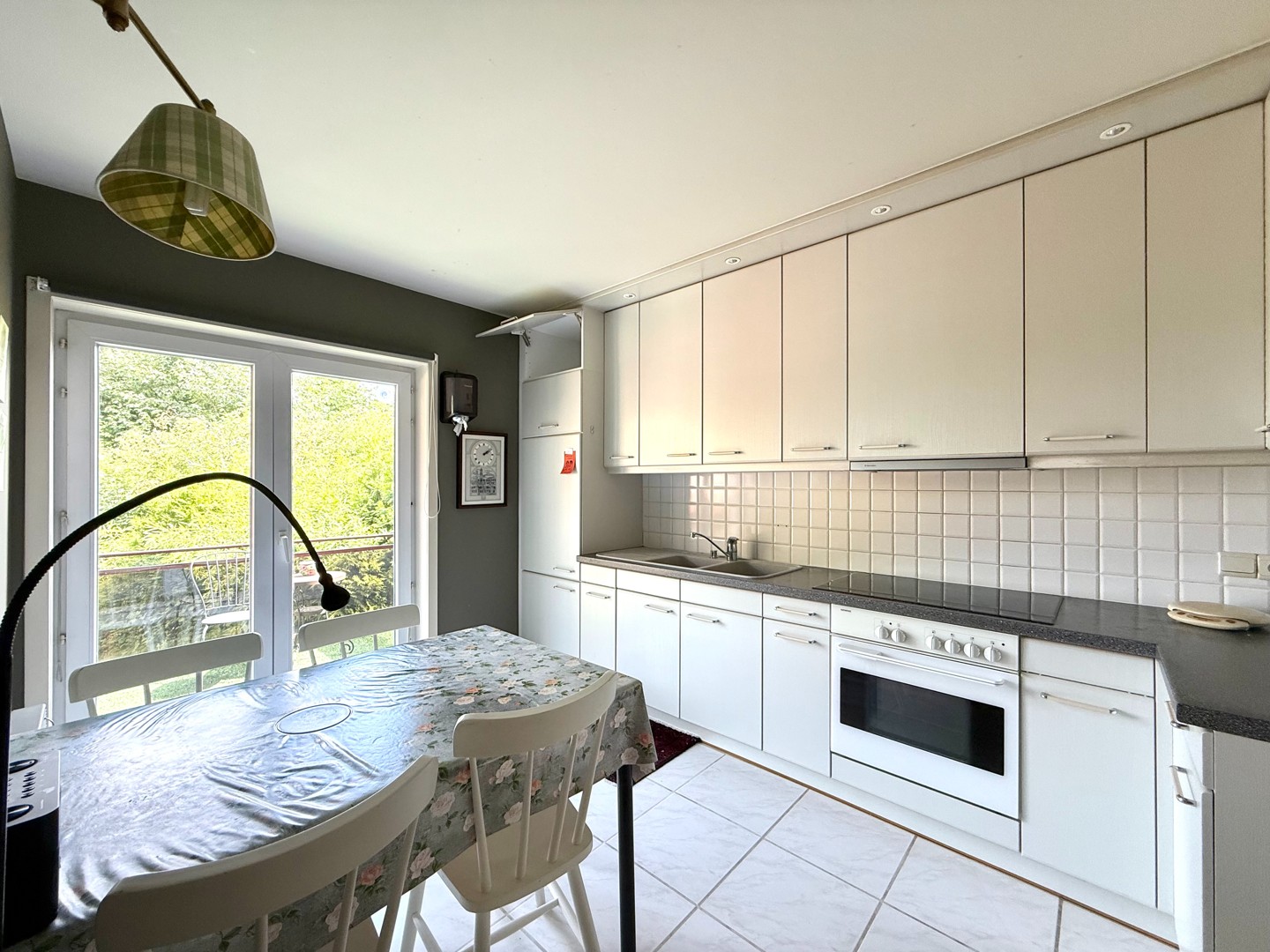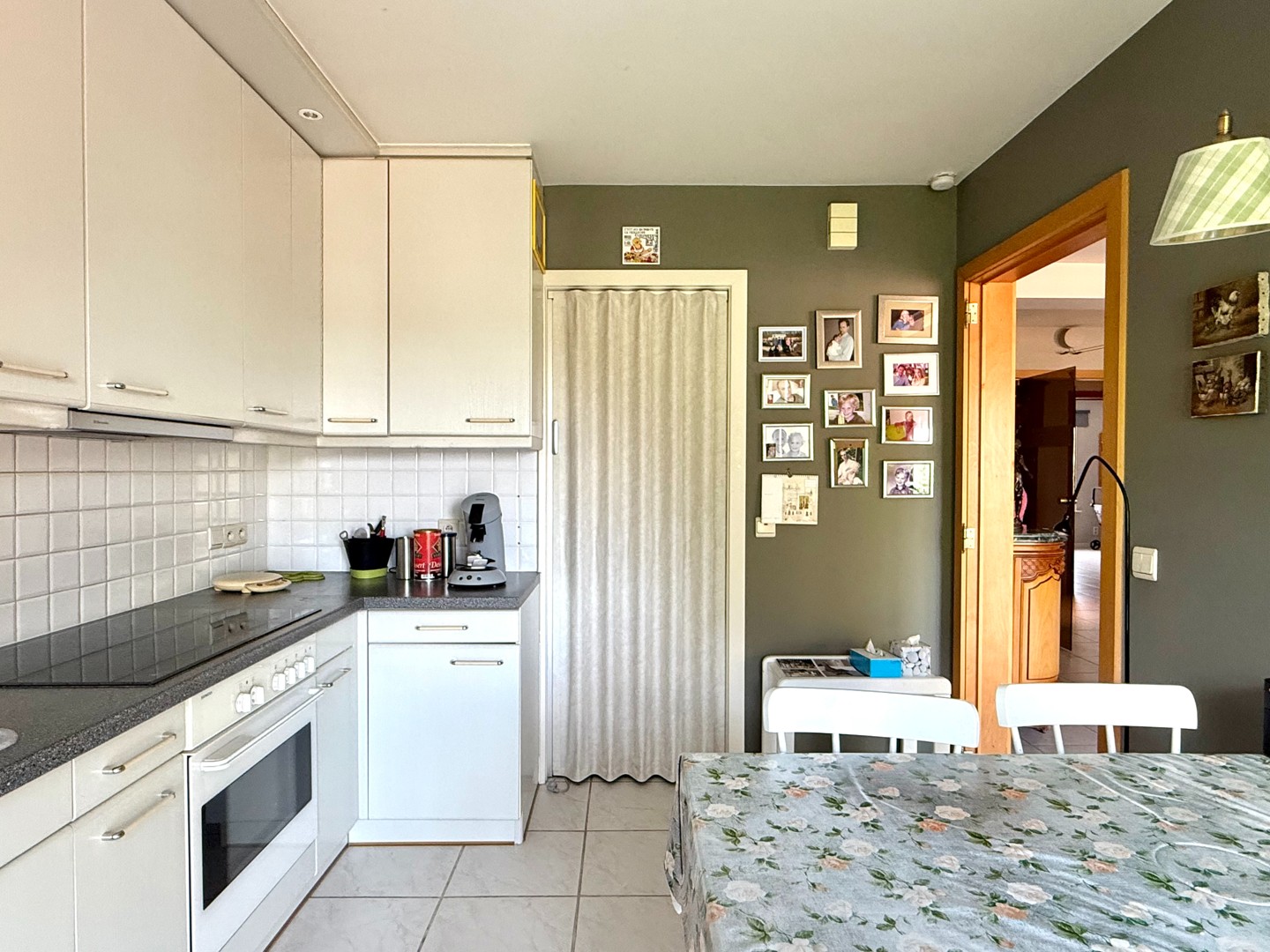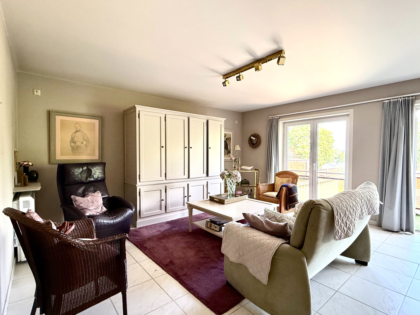 De leefruimte is bijzonder aangenaam dankzij de grote raampartijen die zorgen voor overvloedig natuurlijk licht. De open indeling sluit naadloos aan op de volledig uitgeruste keuken.