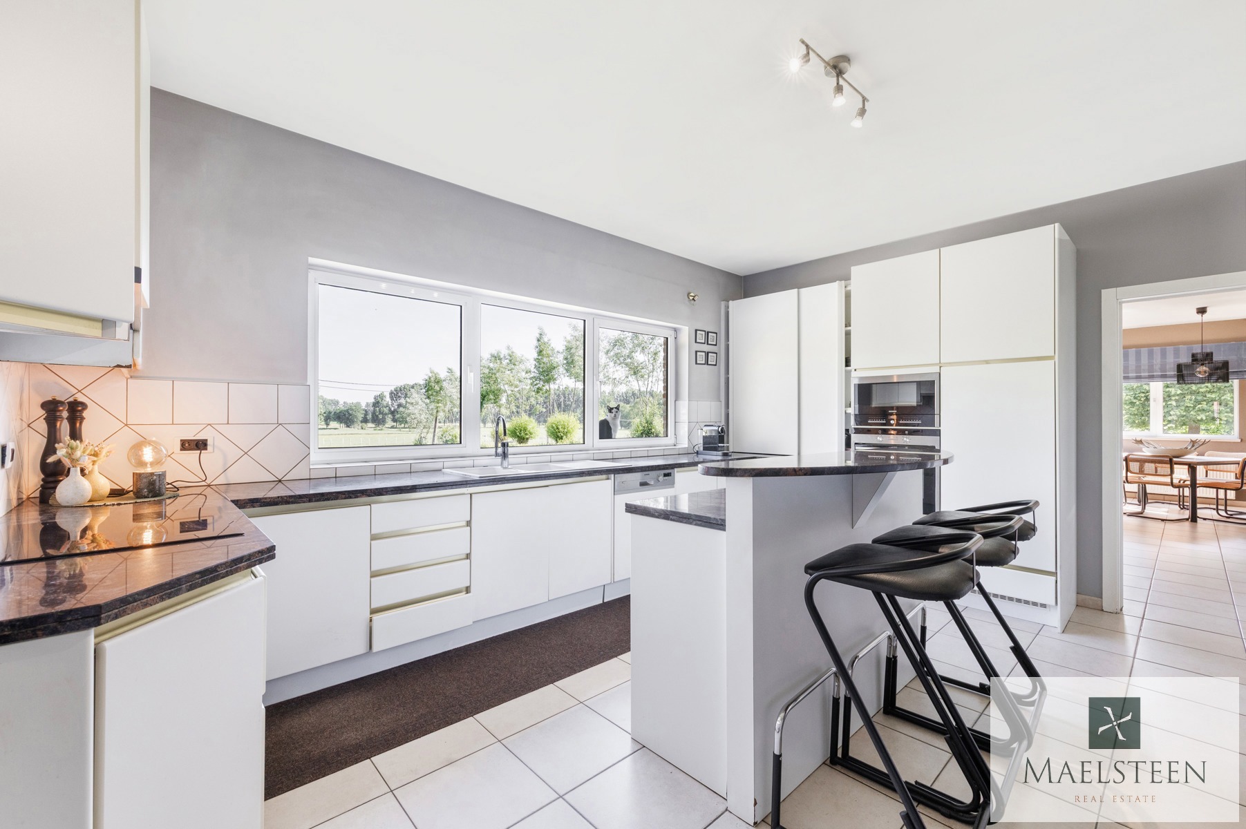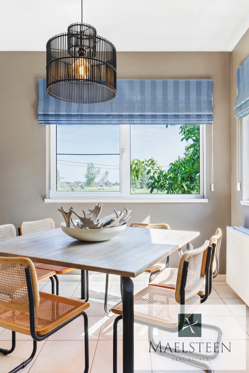 De living grenst aan de heel ruime keuken. Deze keuken heeft een gezellige ontbijthoek, een extra salon, een praktische berging (koelcel installeren?) en een grote bijkeuken. Vanuit de keuken geniet je van een ronduit prachtig zicht over de mooi aangelegde tuin en de weilanden.
