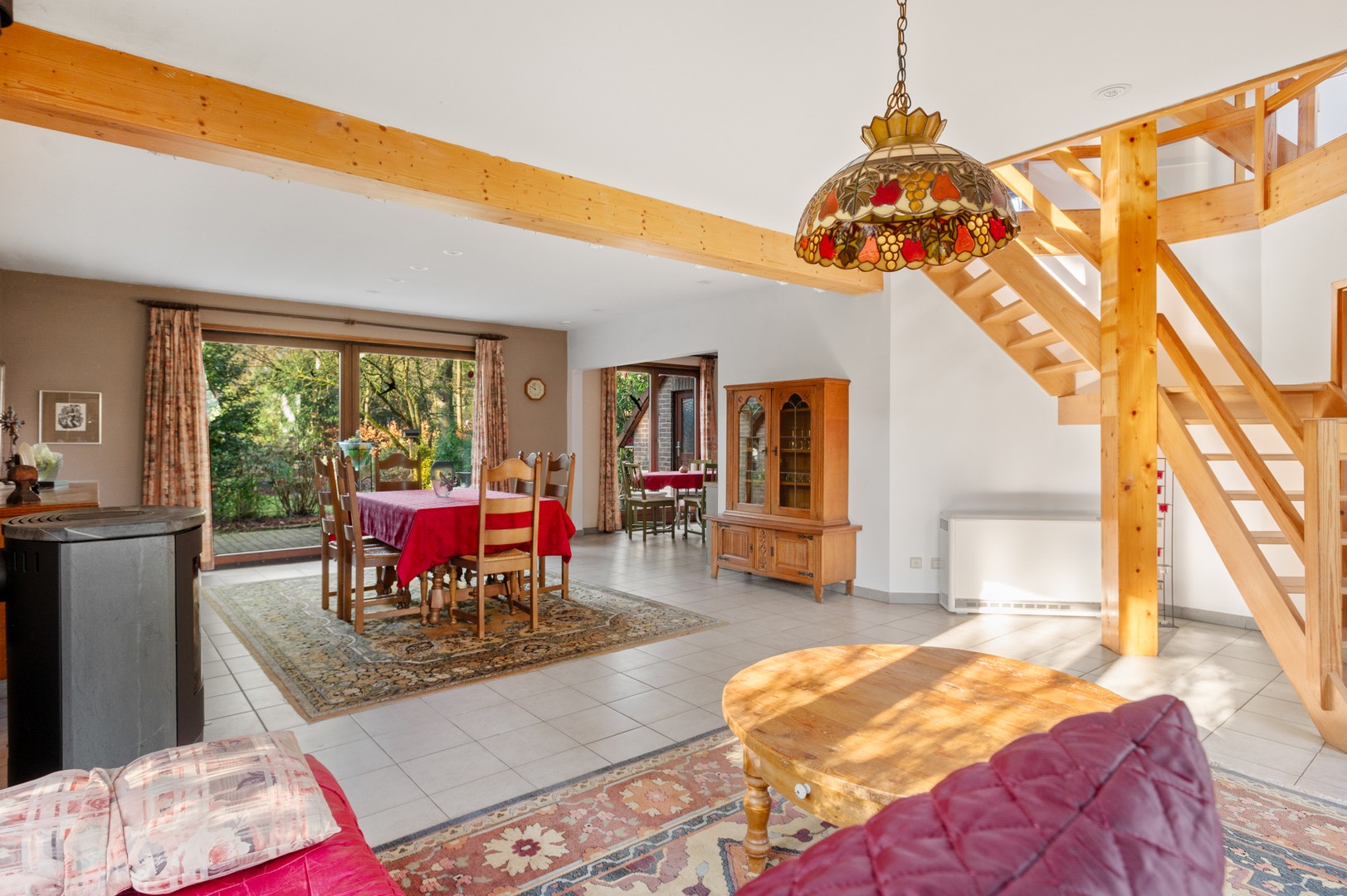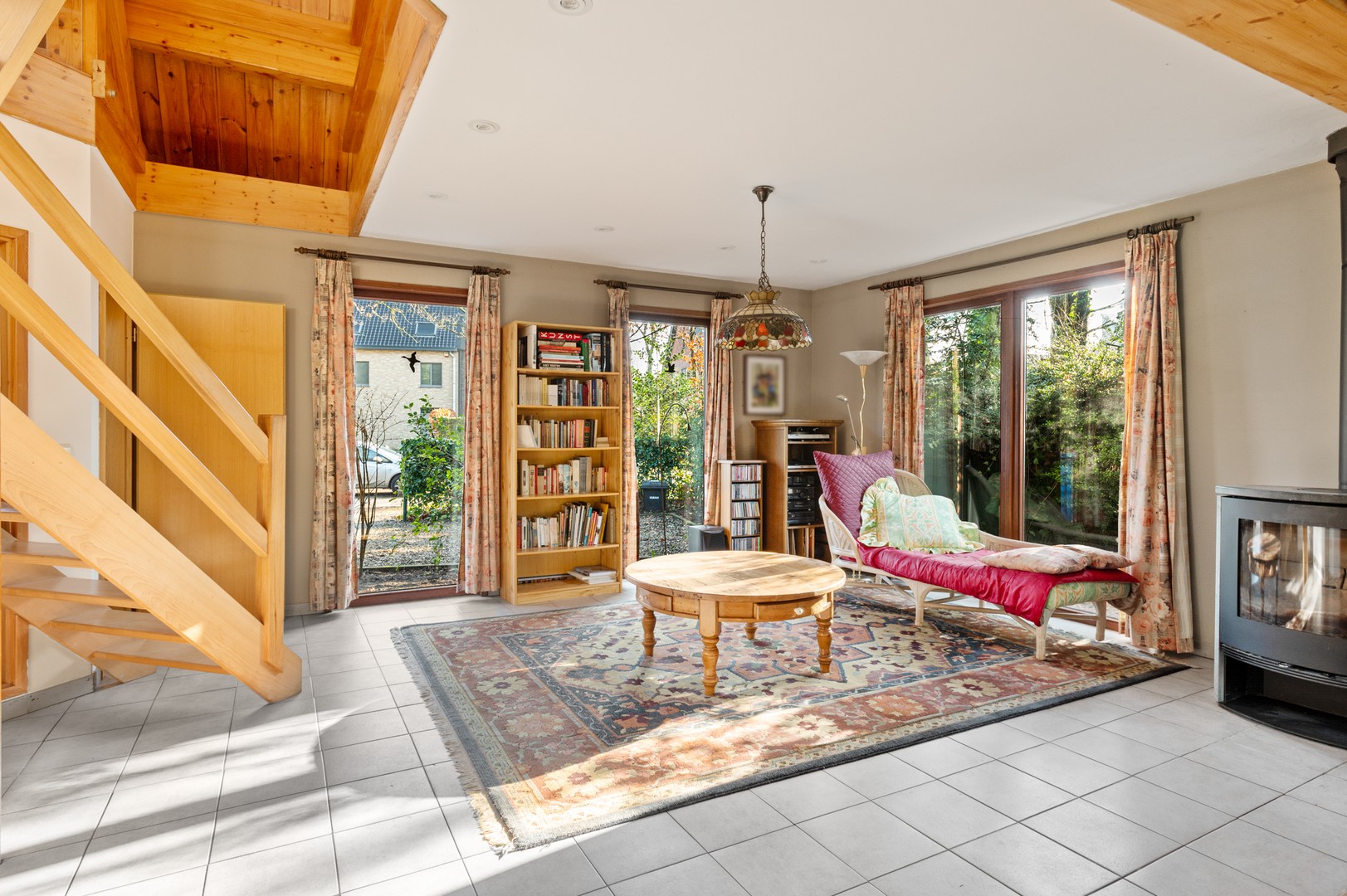 - Lichte leefruimte: op de benedenverdieping lonkt de lichte leefruimte van in totaal 43 m² met kamerhoge raampartijen zowel vooraan als achteraan de woning. In de leefruimte ligt er een handige en gemakkelijk te onderhouden tegelvloer. En op kille herfst- en winterdagen verzamelt iedereen gegarandeerd aan de houtkachel. De verschillende ruimtes van de woning liggen rond een centrale traphal. Die is van beneden tot boven opengetrokken. De trap vertrekt beneden in de woonkamer.
