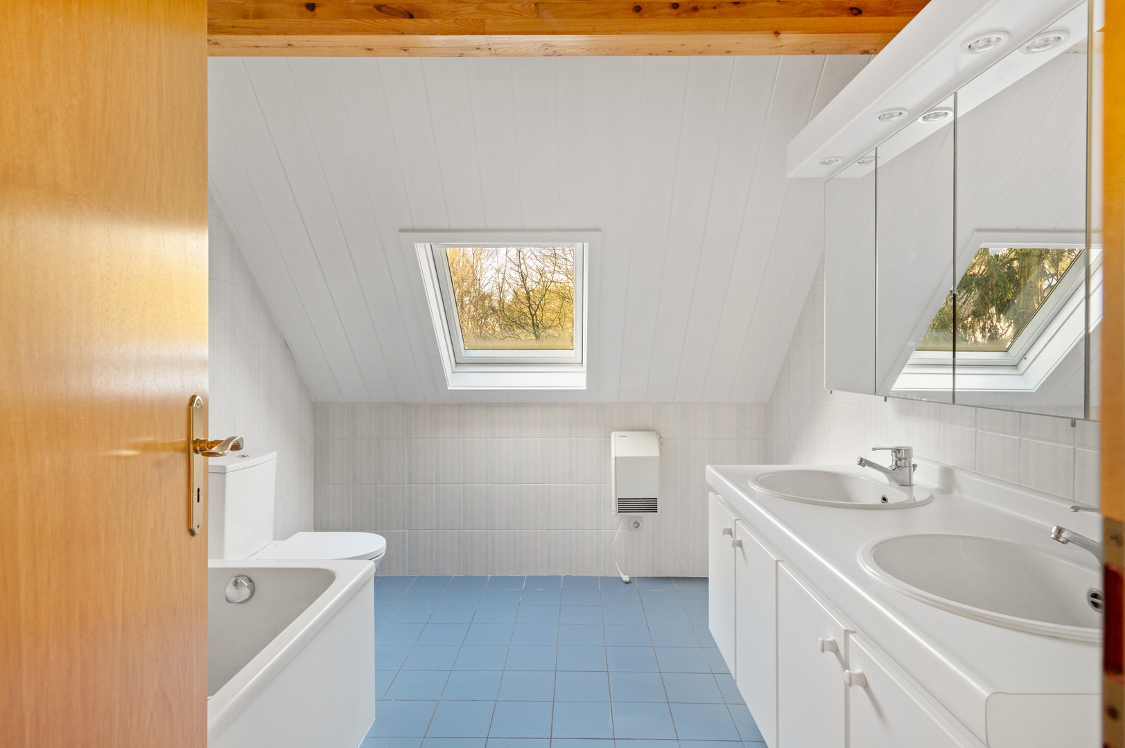 - Badkamer: ook boven is er een frisse, witte badkamer voorzien met een ligbad met douchemogelijkheid, dubbele wastafel met wandmeubel en toilet. Het raam zorgt voor licht en verse buitenlucht.