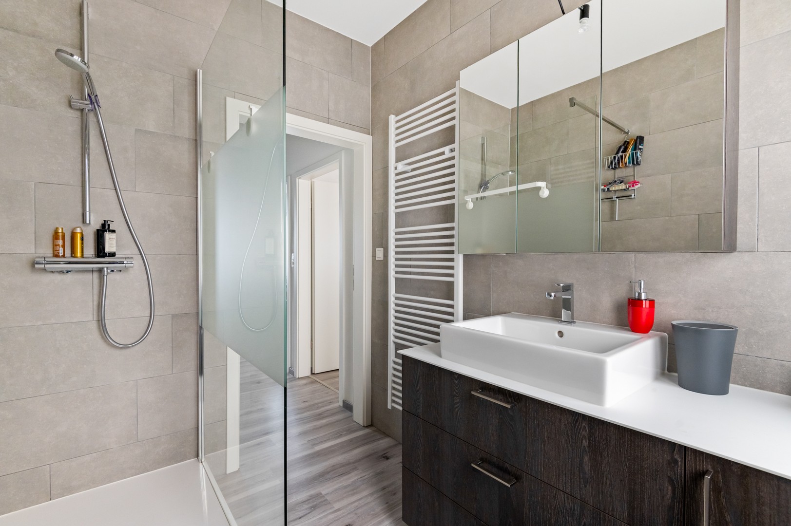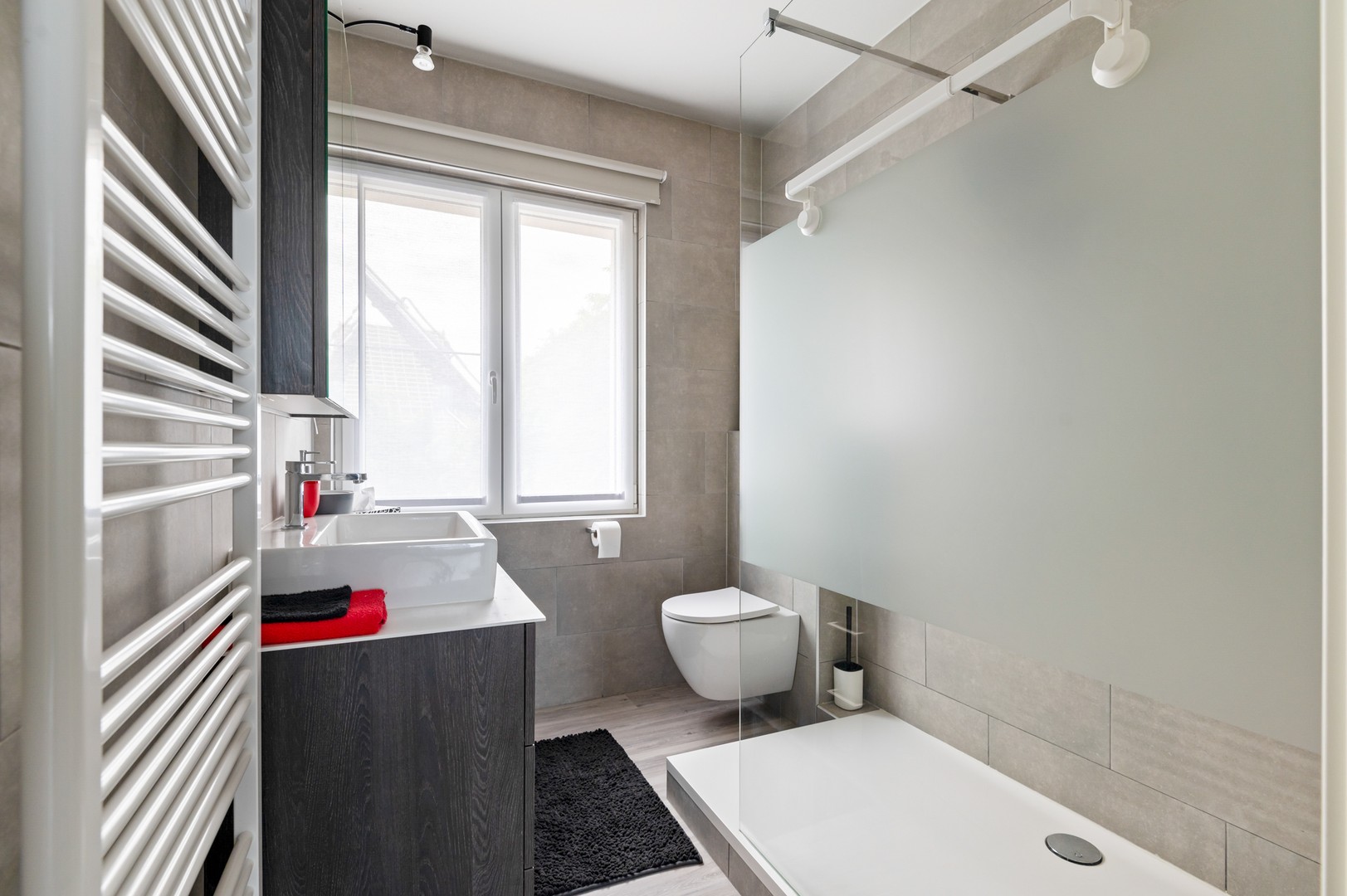 - Badkamer met inloopdouche: de pas vernieuwde badkamer (2023) heeft een inloopdouche, een 2de toilet en wandmeubel met lavabo. U vindt er ook een handdoekdroger. De badkamer heeft een propere en makkelijk te onderhouden tegelvloer – dweil erover en klaar.