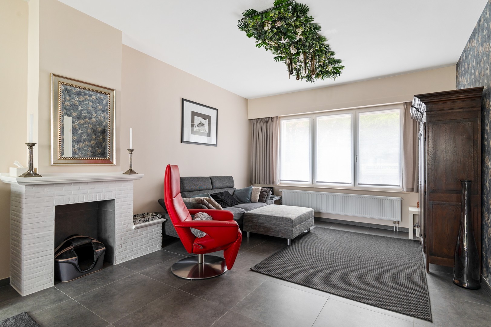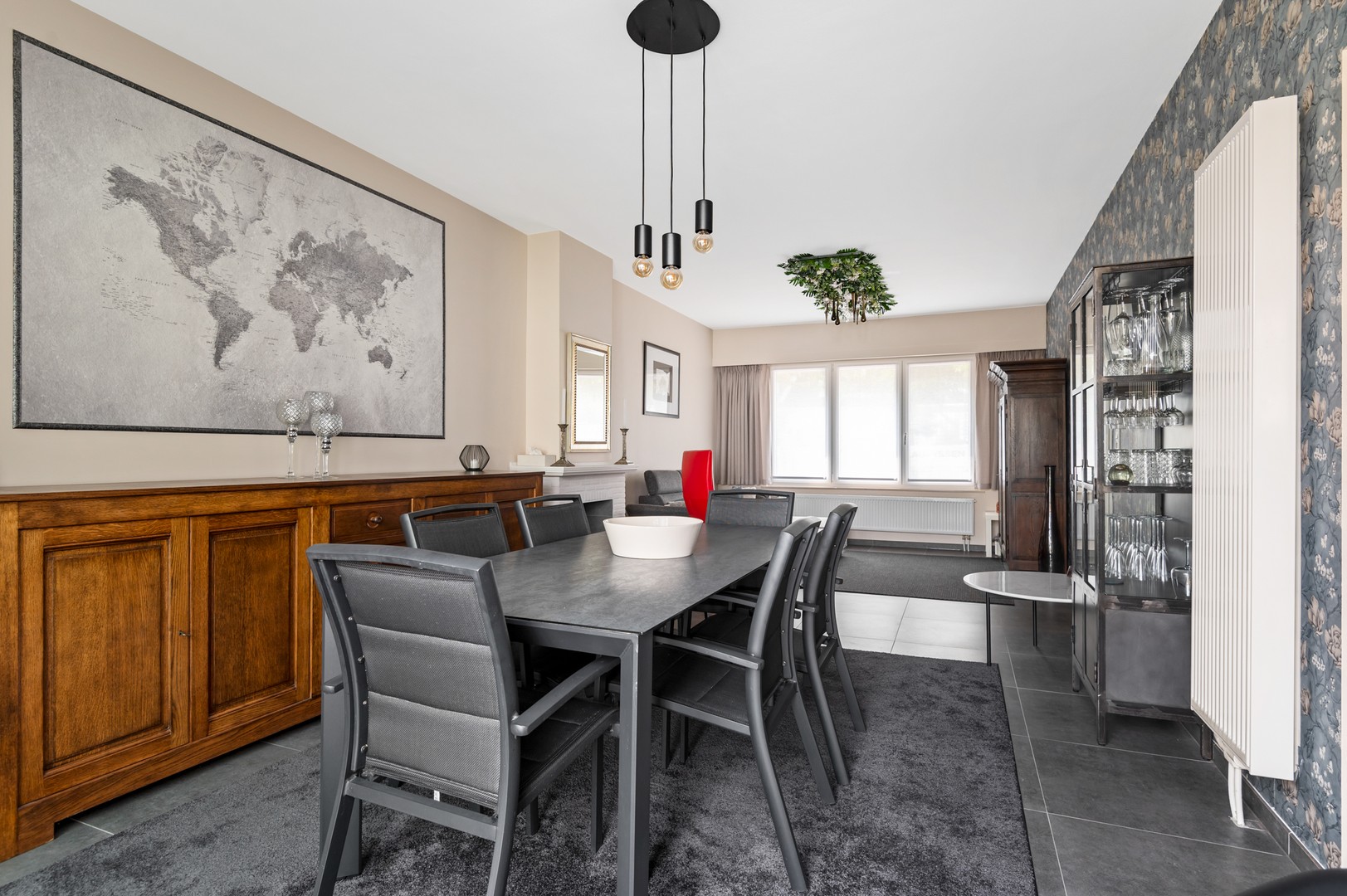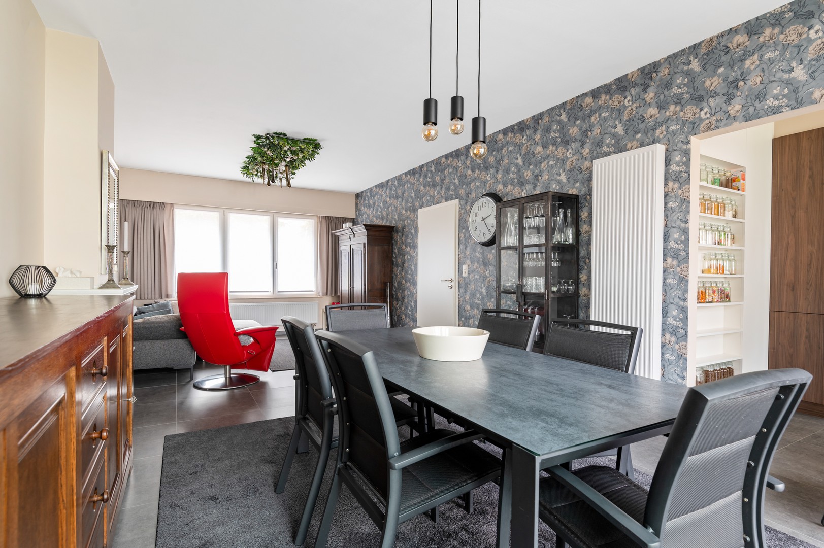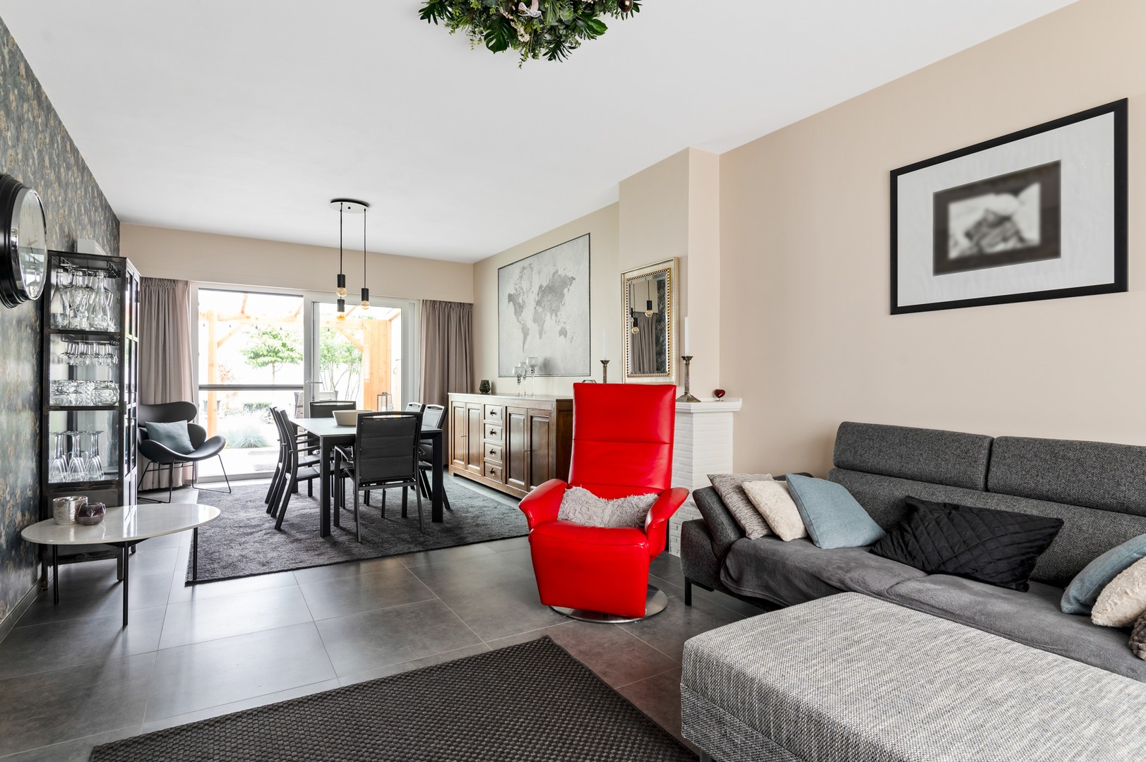 - Lichtrijke leefruimte: via de inkomhal wandelt u de ruime leefruimte in. Daar komt veel licht binnen dankzij de grote raampartijen aan beide kanten. Hierdoor hoeft u overdag amper het licht aan te knippen en geniet u van het zicht op de prachtige tuin. Aan de straatzijde van de woning is er een ruim salon voorzien om heerlijk in neer te vlijen. Aan de andere kant van de ruimte staat de eettafel die uitkijkt op de tuin.