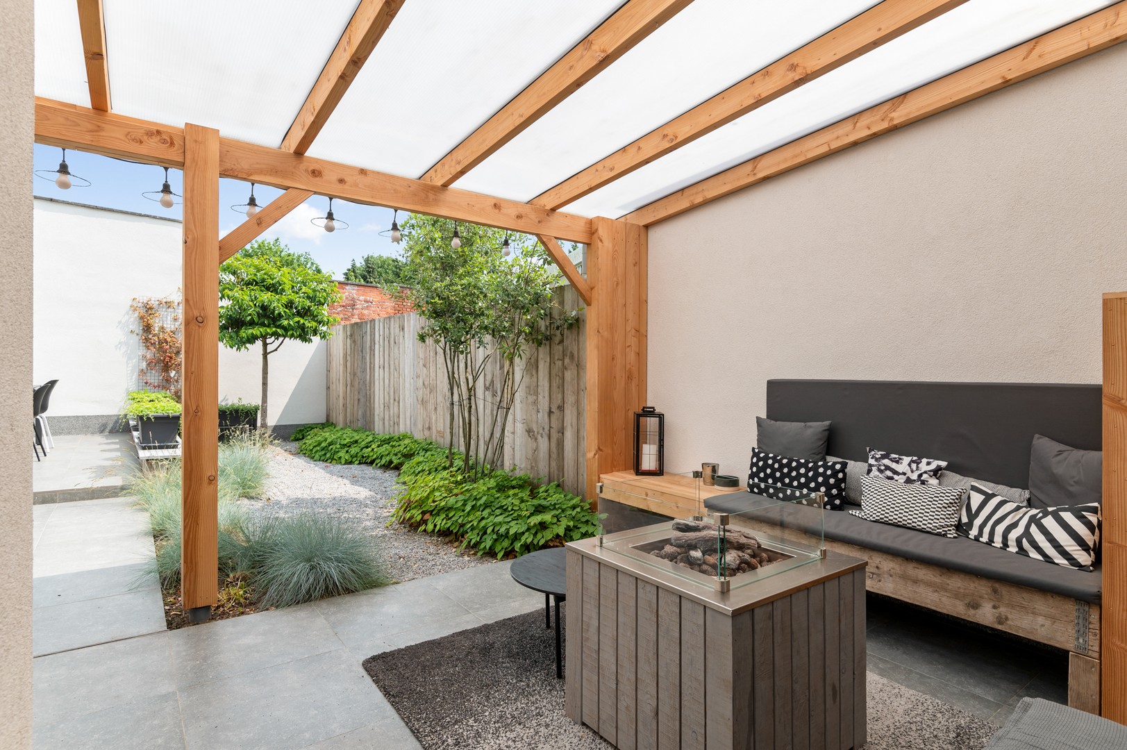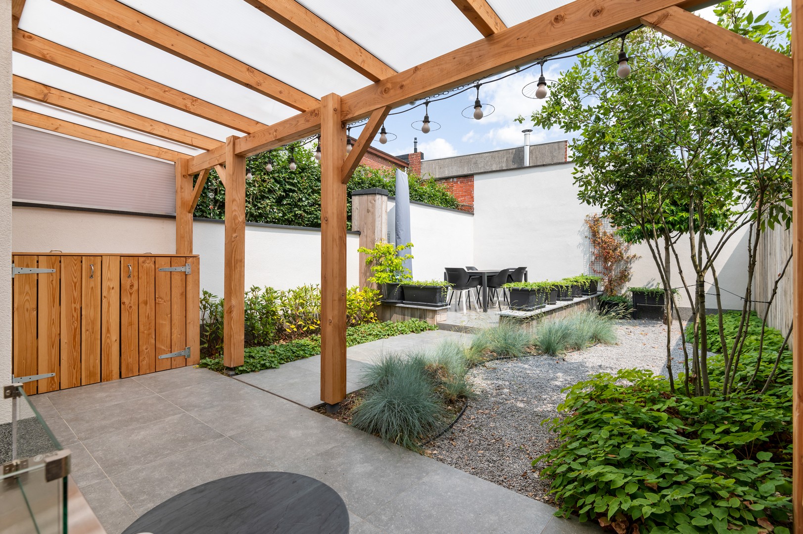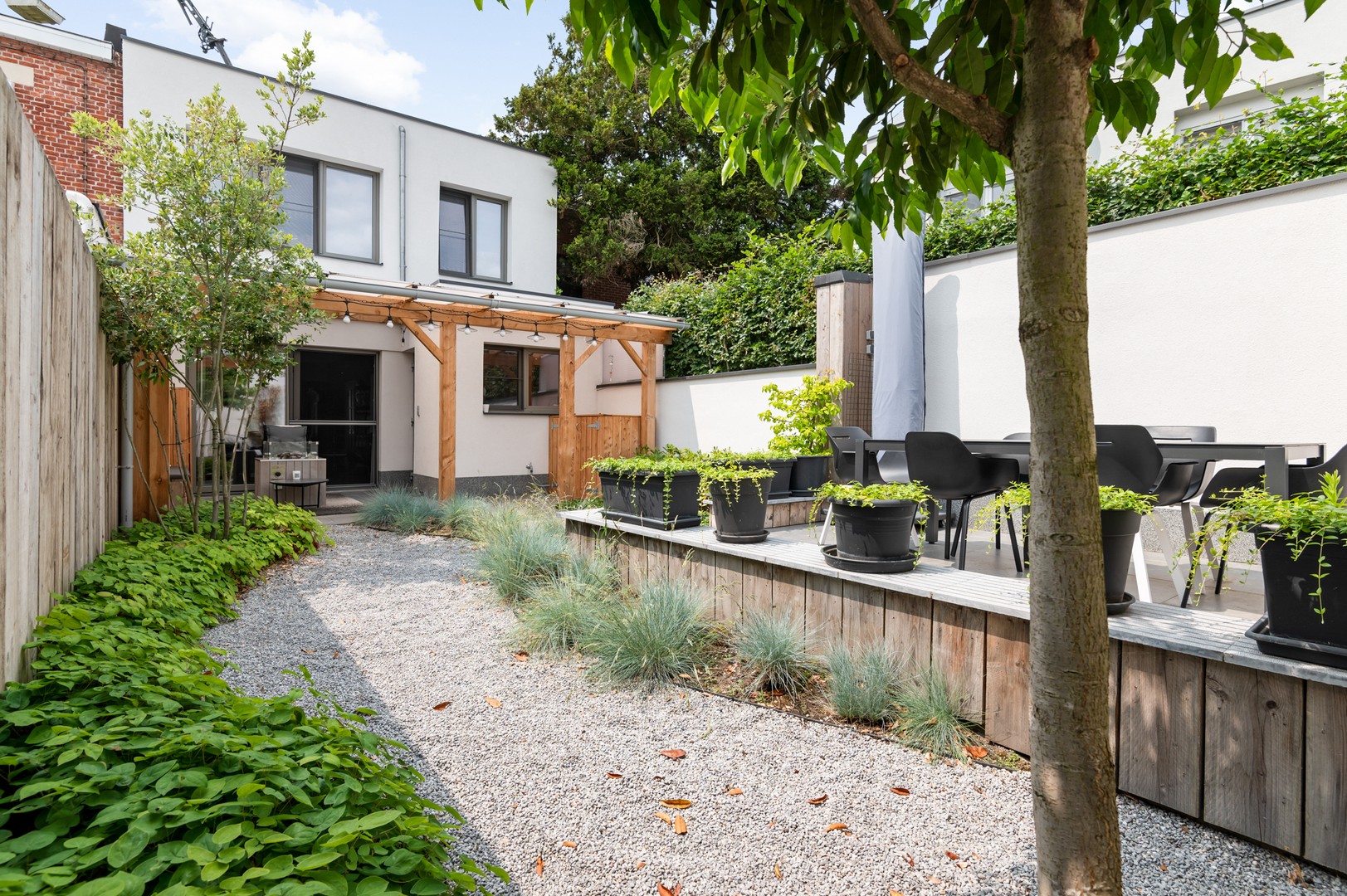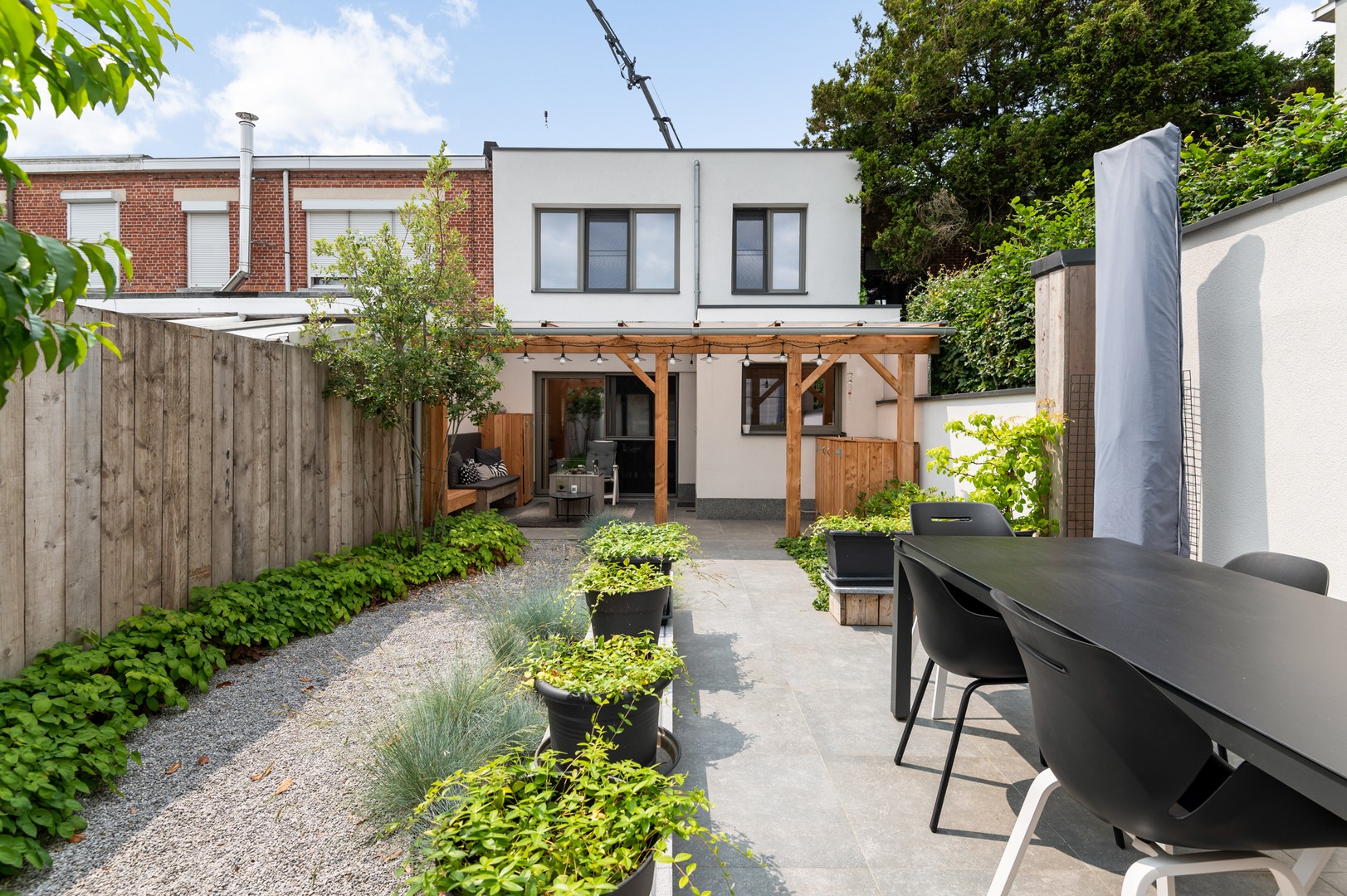 - Tuin: Via het grote schuifraam in de leefruimte, of de deur in de keuken betreed je de tuin. Deze recent gerenoveerde tuin vraagt amper onderhoud en is bedoeld om maximaal te genieten, bijvoorbeeld met een cocktail op het overdekt terras of tafelen op het ruim terras achteraan. En als de zon ondergaat knipt u de buitenverlichting aan voor een magische zomeravond.