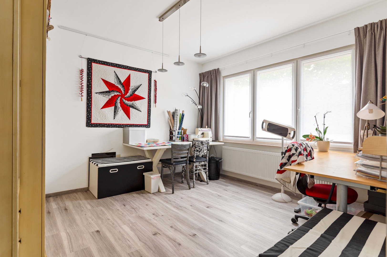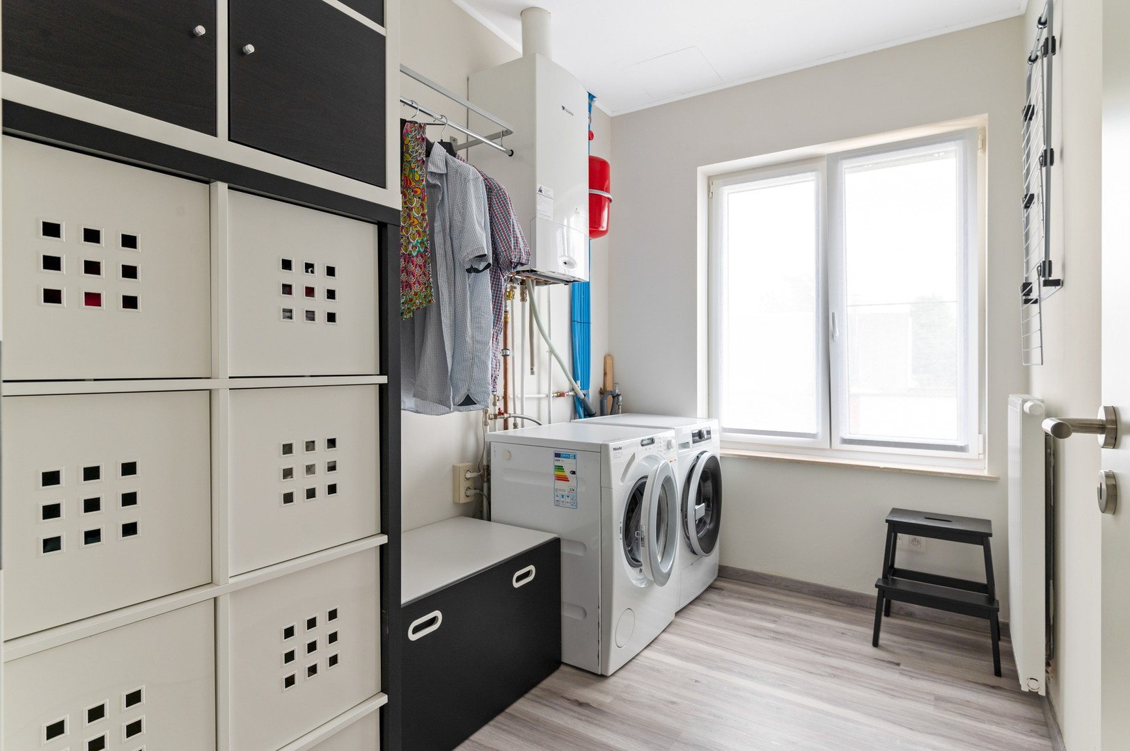 - Waskamer/bureauruimte: naast de slaapkamers zit de waskamer. Deze kamer is ca 6m² groot en heeft aansluitingen voor wasmachine en droogkast. Ook is hier de condensatieketel van Junkers (2019) terug te vinden. Deze handige wasruimte kan ook gebruikt worden als bureau of opslagruimte.