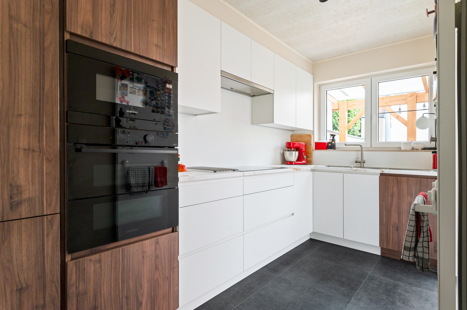 - Keuken: aansluitend aan de leefruimte loopt u door naar de ruime recent gerenoveerde (2023) moderne keuken. De keuken is volledig geïnstalleerd en is voorzien van ingebouwde koelkast en vriezer, combi-oven, 2-delige oven, inductievuur, dubbele wasbak en een vaatwasser. In de keuken is er gebruik gemaakt van kwalitatieve materialen en baad je in het natuurlijk daglicht.