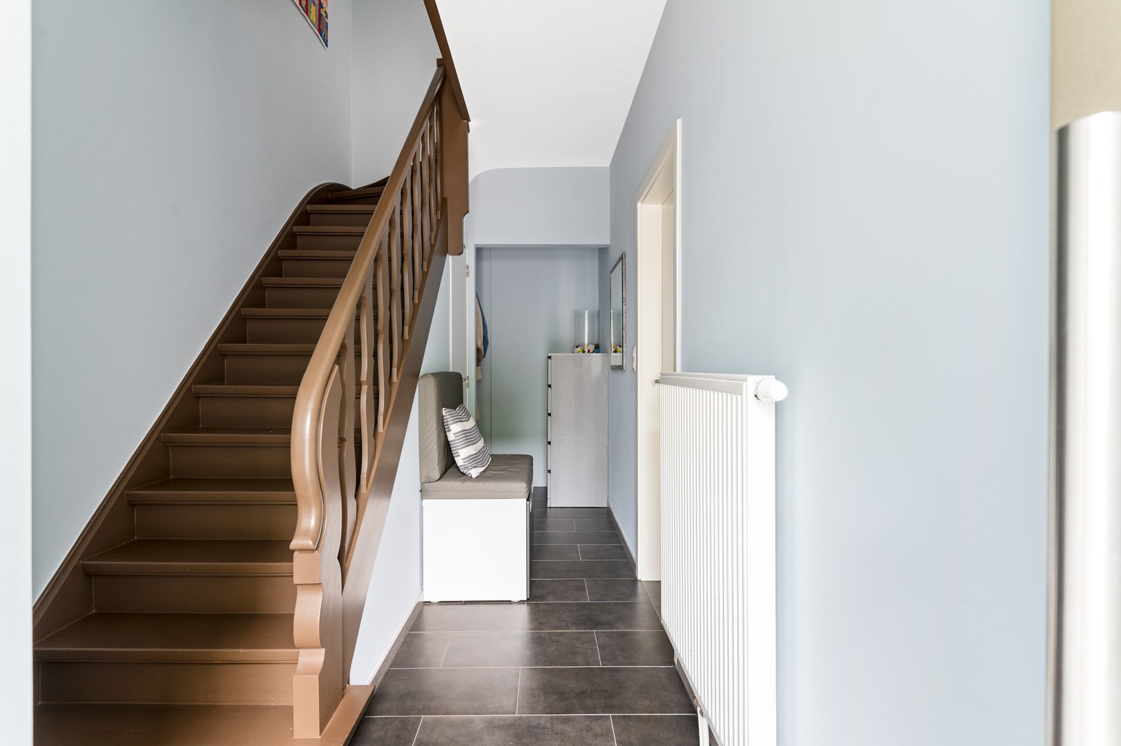 - Inkomhal en toilet: welkom thuis! De rustige omgeving imponeert meteen als u deze wijk binnenrijdt. Eens aangekomen bij de woning parkeert u recht voor de deur op de privéstaanplaatsen en neemt u het wandelpad dat leidt tot de voordeur. U komt binnen in de hal – waar u toegang krijgt tot een gastentoilet, de leefruimte, en u neemt er de trap naar de eerste verdieping en de kelder.