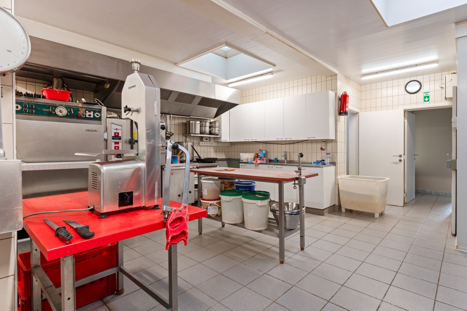 - Werkruimte: met een oppervlakte van ca. 115 m2 hebt u een zeer grote werkplaats achteraan. Deze werkruimte is voorzien van 3 ruime koelcellen en is ruim genoeg voor alle losstaande slagerijtoestellen. Je vind naast de industriële keuken overal kwalitatieve machines, die indien gewenst mee aangekocht kunnen worden. Door de lichthoepels in de werkruimte heeft u er de hele dag door natuurlijk licht.