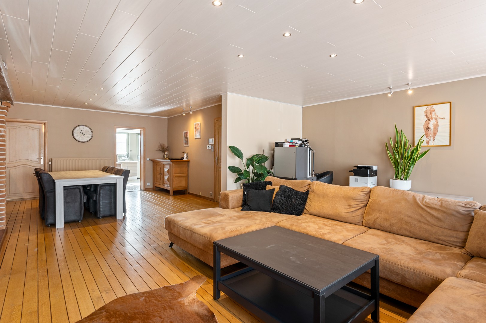 - Leefruimte: de grote leefruimte van ca 55m² heeft voldoende lichtinval door de kamerbrede- en hoge raampartijen, voorzien van elektrische rolluiken. Deze leefruimte biedt voldoende plaats voor een ruime eettafel, een zithoek en een bureauhoek. Daarnaast is er voldoende ruimte om kasten te plaatsen. De originele parket en de authentieke schouw zorgen voor een sfeervolle touch die de leefruimte extra gezellig maakt. Vanuit de leefruimte krijg je toegang tot de keuken en de bergruimte.