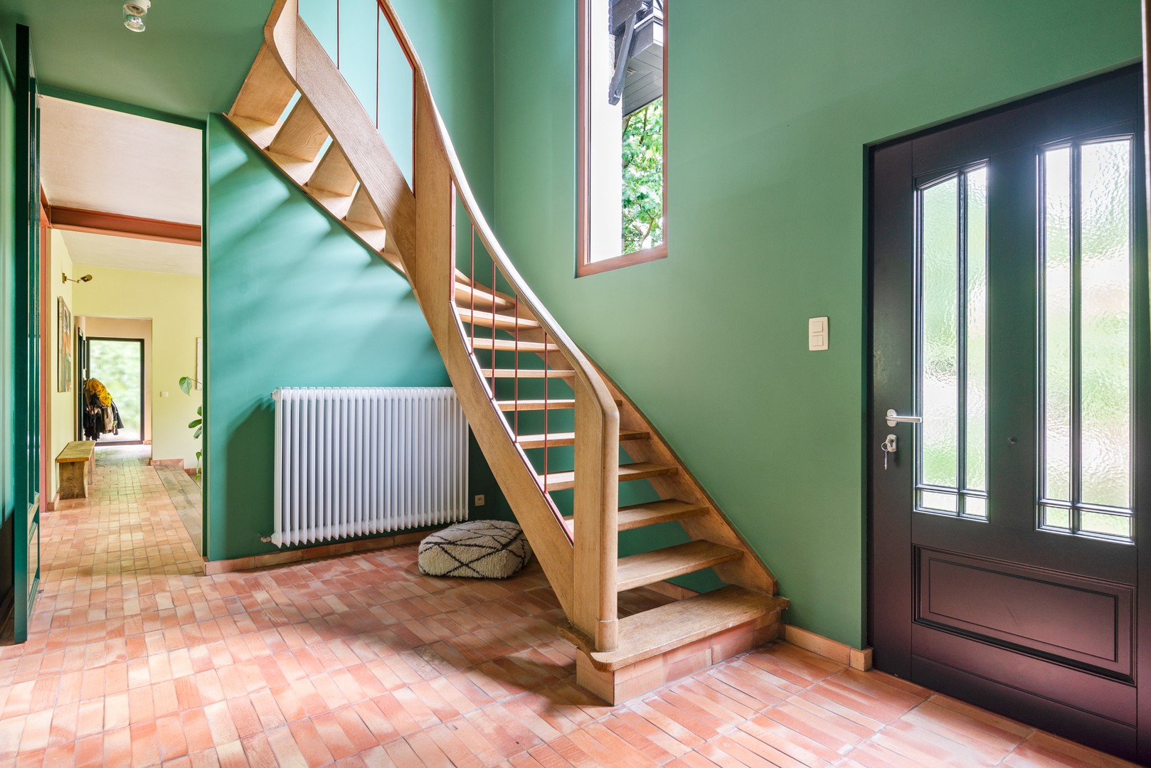 - Hal: welkom thuis! Waar u ook staat in deze villa, 3 elementen komen altijd terug: ruimte, licht en zicht op groen. En dat start al in de grote hal. Via de hal komt u ook bij de woonkamer, leefruimte en de trap leidt u naar de 1ste verdieping.