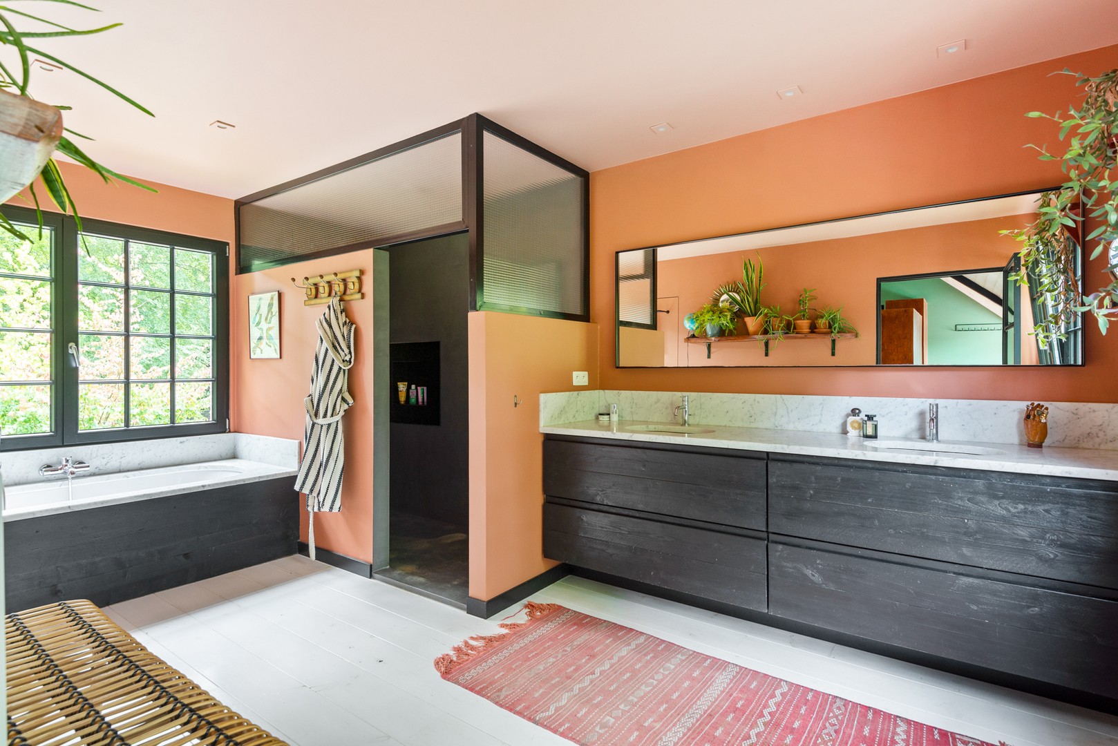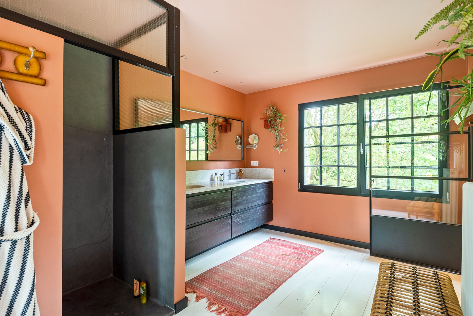 - Badkamer met bad: de badkamer heeft alles wat u nodig hebt. Een wandmeubel met een dubbele wastafel, een heerlijk ligbad om volledig tot rust te komen met zicht op de tuin en een grote inloopdouche. Het handdoekenrek doet niet alleen dienst om handdoeken te drogen – er zit ook een slimme opbergruimte achter verstopt. Verder vindt u nog een apart toilet.