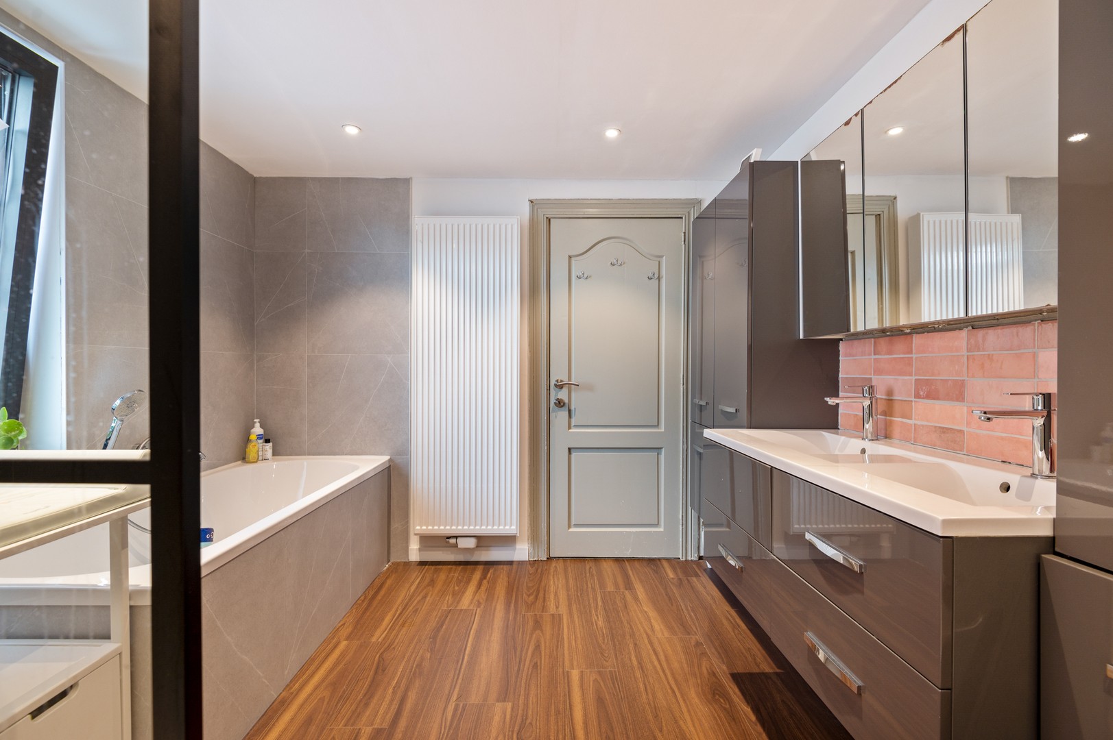 - Badkamer: in deze moderne badkamer ontspant u helemaal na een zware (werk)dag. De muur is gedeeltelijk betegeld. Naast een ligbad is deze badkamer ook voorzien van een ruime inloopdouche. En onder de dubbele wastafel is er plaats genoeg voor handdoeken en zeep. Verder heeft de badkamer nog 2 kolomkasten, een hangtoilet, wandradiator en afzuigventilator. Deze badkamer is ca 9,5m².