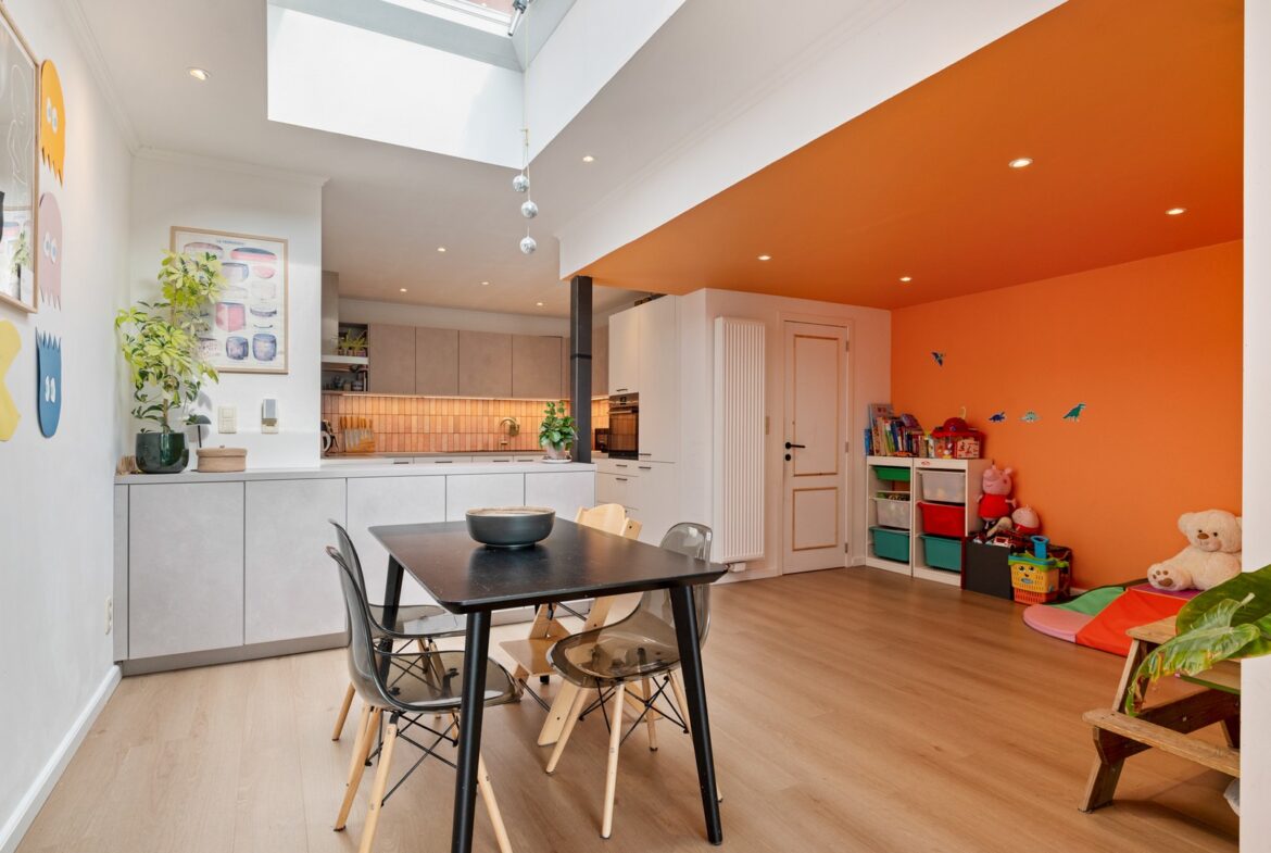 - Lichtrijke leefruimte: via de inkomhal wandelt u de ruime leefruimte van ca 42,5 m² in. Daar komt veel licht binnen dankzij de grote raampartij en de dakkoepel. Hierdoor hoeft u overdag nooit het licht aan te knippen en geniet u van het zicht op de prachtige tuin. Aan de tuinzijde van de woning is er een ruim salon voorzien om heerlijk in neer te vlijen. Centraal in het salon staat de pellet kachel. Deze zorgt voor extra verwarming alsook voor sfeer op winteravonden. Aan de andere kant van de ruimte staat de eettafel met aansluitend de moderne open keuken. Deze leefruimte is in 2022 volledig nieuw gebouwd geweest.
