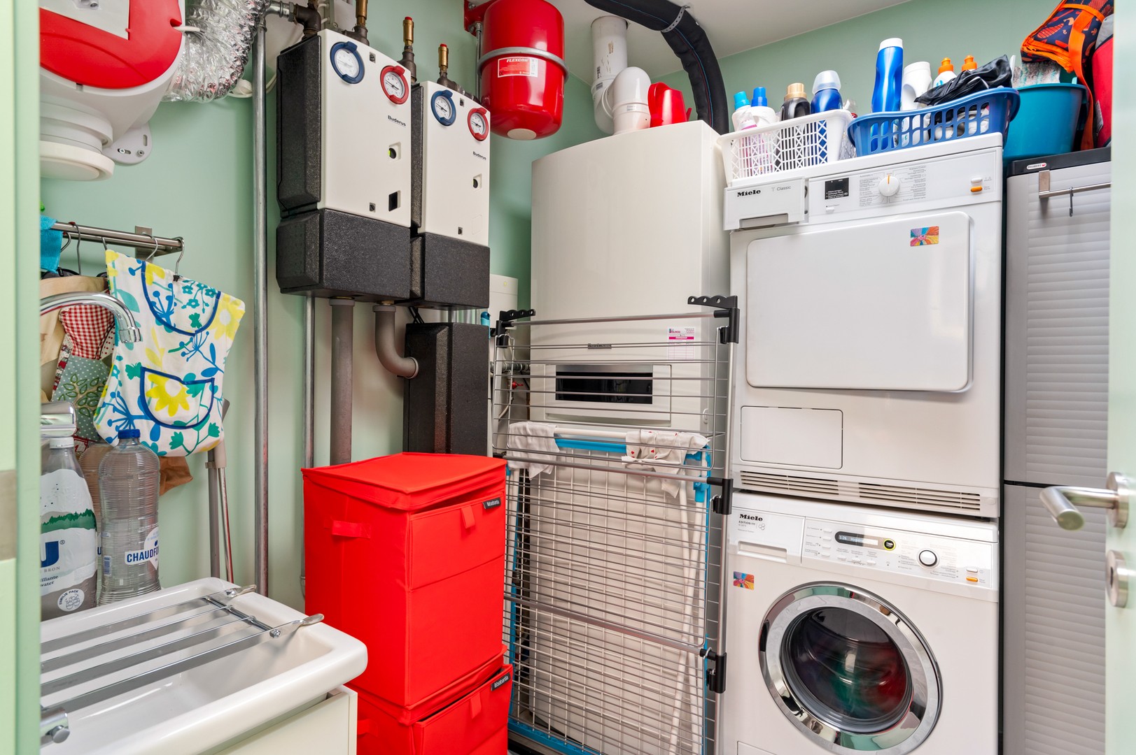 - Berging/technische ruimte: Tegenover de keuken bevindt zich de bergruimte. In deze ruimte van ca 5.6m² bevindt zich een verwarmingsketel van Buderens, verbonden aan de 2 zonneboilerpanelen op het dak. Ook vind je hier de aansluitingen voor wasmachine en droogkast, het ventilatiesysteem en een lavabo. Deze bergruimte loopt nog deels door onder de trap, waar alle meters terug te vinden zijn.