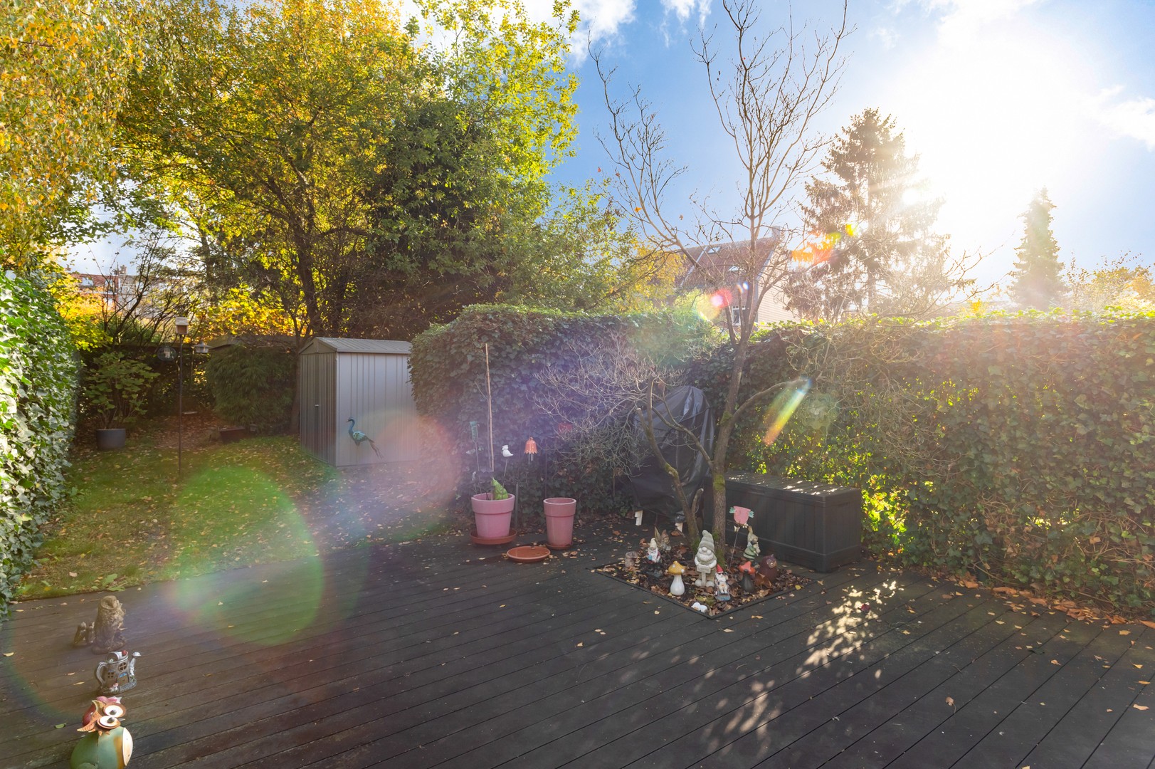 - Tuin: via de eetruimte, alsook de zijkant van de woning is de tuin bereikbaar. Deze tuin is ca 140m² groot en is naar het Oosten georiënteerd. Vooraan de tuin is er een terras van ca 29m² groot voorzien. In deze tuin zijn achteraan twee tuinhuizen voorzien, om het tuinmateriaal te stockeren. De tuin is reeds voorzien van buitenverlichting, een kraantje en een bovengrondse regenwatertank met kraantje