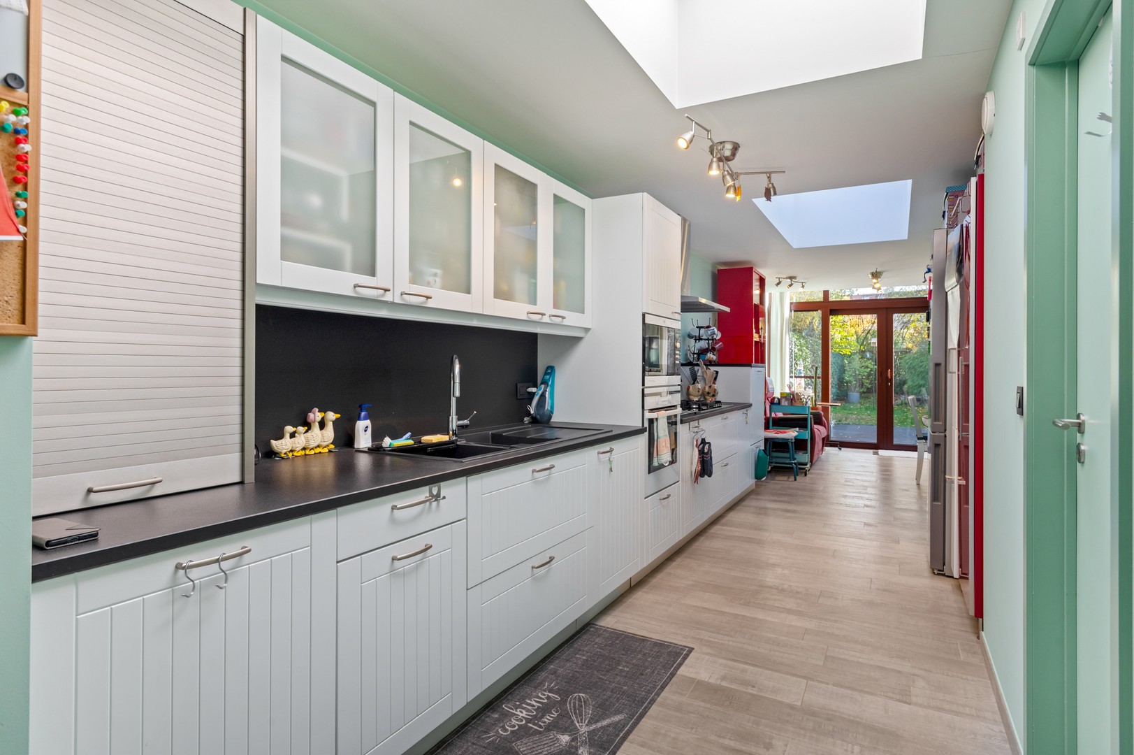 - Lichtrijke leefruimte met open keuken: via de inkomhal wandelt u de ruime leefruimte in. Deze ruimte is ca 26,5m² groot en baadt in het licht door de grote ramen aan zowel de voor als achterzijde en door de dakkoepels. Hierdoor hoeft u overdag amper het licht aan te knippen. Aan de straatzijde van de woning is er een knus salon voorzien om heerlijk in neer te vlijen. Naast de leefruimte staat de eettafel. Via de leefruimte krijg je toegang tot de moderne open keuken. De leefruimte werd voorzien van een kurkvloer.