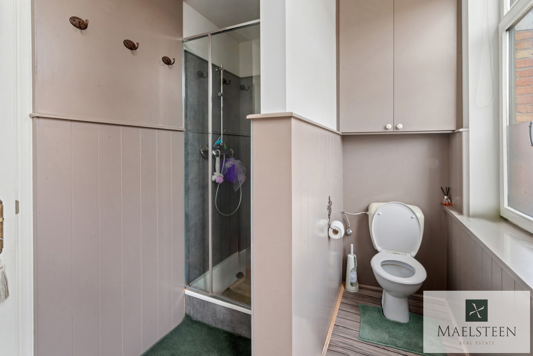 Op de eerste verdieping is er de master bedroom met ingewerkte kastenwand en een stijlvolle badkamer (vernieuwd in 2024) met inloopdouche, lavabomeubel en toilet. Op de tweede verdieping bevinden zich een extra slaapkamer en een bijkomende berging/slaapkamer.