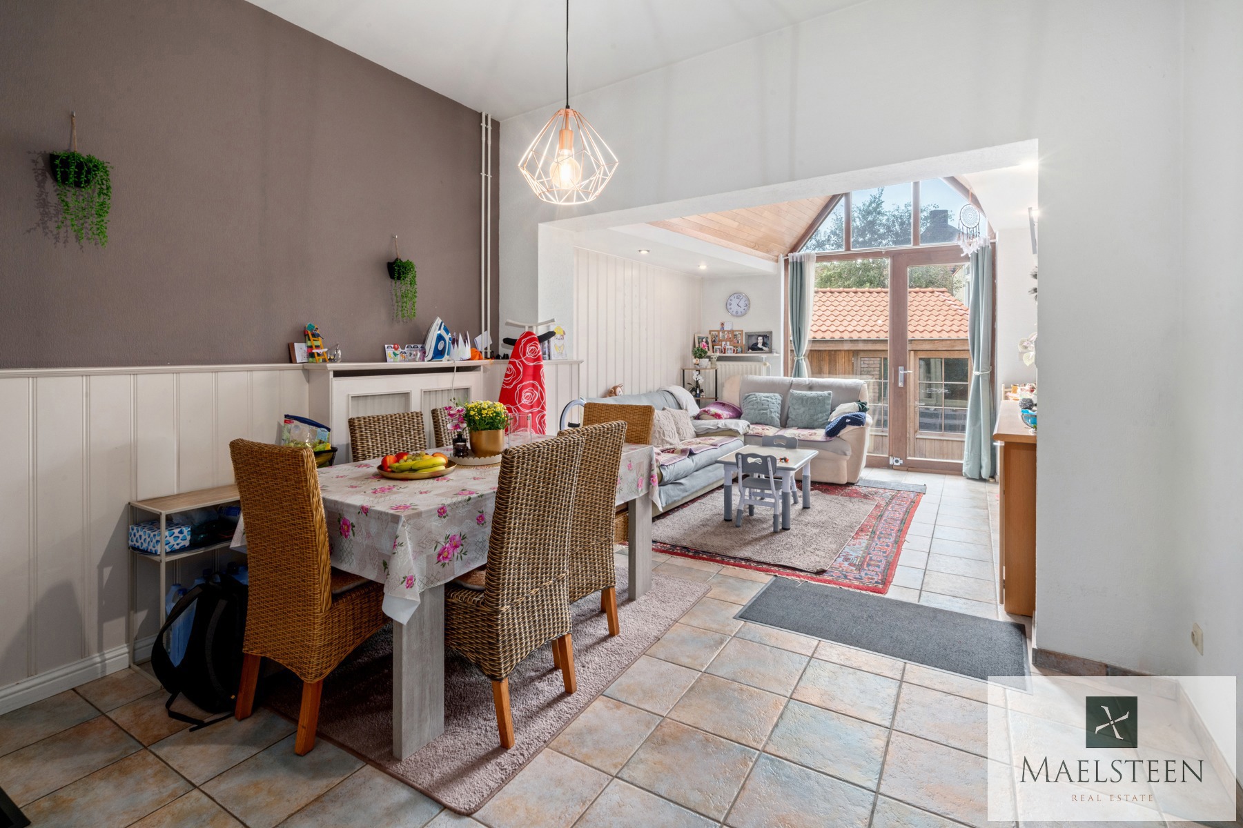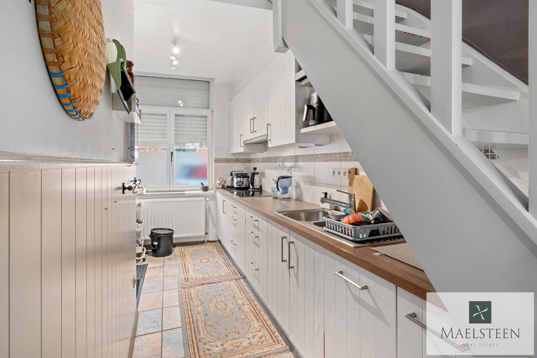 Op het gelijkvloers bevindt zich de inkomhal en een volledig ingerichte open keuken aan de straatzijde. De leefruimte ademt gezelligheid uit dankzij de lambrisering, de sfeervolle inbouwverlichting en de lichtrijke uitbouw met een grote glaspartij en schuifraam dat uitgeeft op een zalig, zuidgericht terrastuintje. Achteraan werd een ruime berging in padouk voorzien. Tuin en tuinberging heraangelegd in 2024.