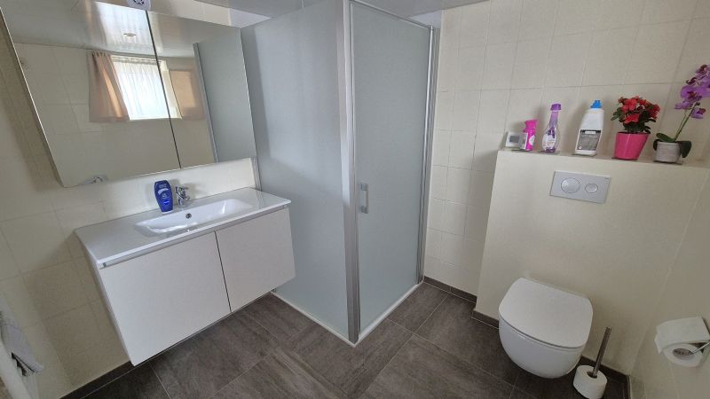 •Nieuwe badkamer met douche, lavabomeubel en toilet