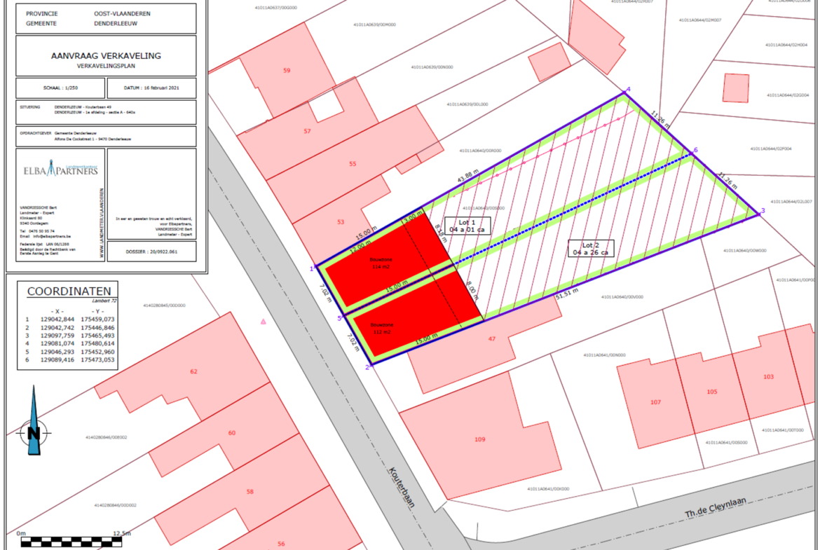 Voor meer info, bel 053/59.49.34 – Perceel bouwgrond (Lot 2) gelegen aan de Kouterbaan 49 te Denderleeuw, geschikt voor gesloten bebouwing met een oppervlakte van 4a 26ca.