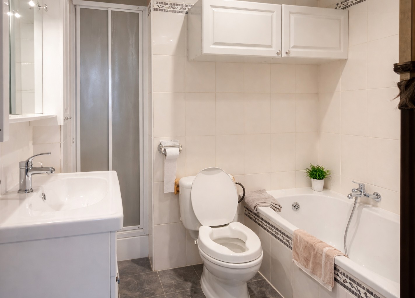 - Badkamer met douche, ligbad, lavabomeubel en toilet