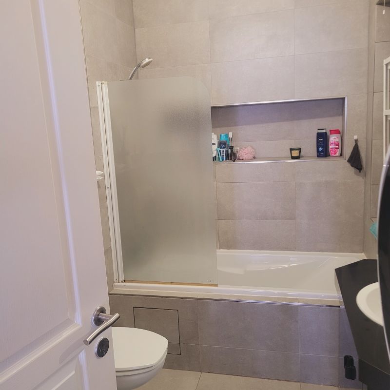 •Nieuwe badkamer met lavabomeubel, ligbad met douchepaneel en toilet