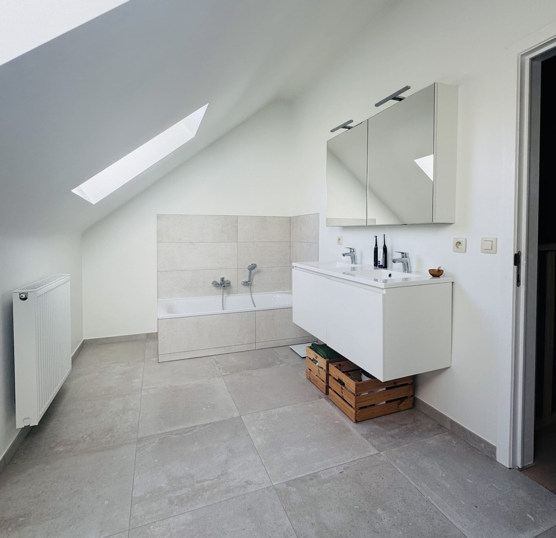 De woning beschikt over drie slaapkamers, waarvan twee royale kamers van 17,5 m². De badkamer is uitgerust met dubbele lavabo, ligbad en inloopdouche. Zowel de eerste als de tweede verdieping zijn afgewerkt met parketvloeren, wat voor een warme uitstraling zorgt.